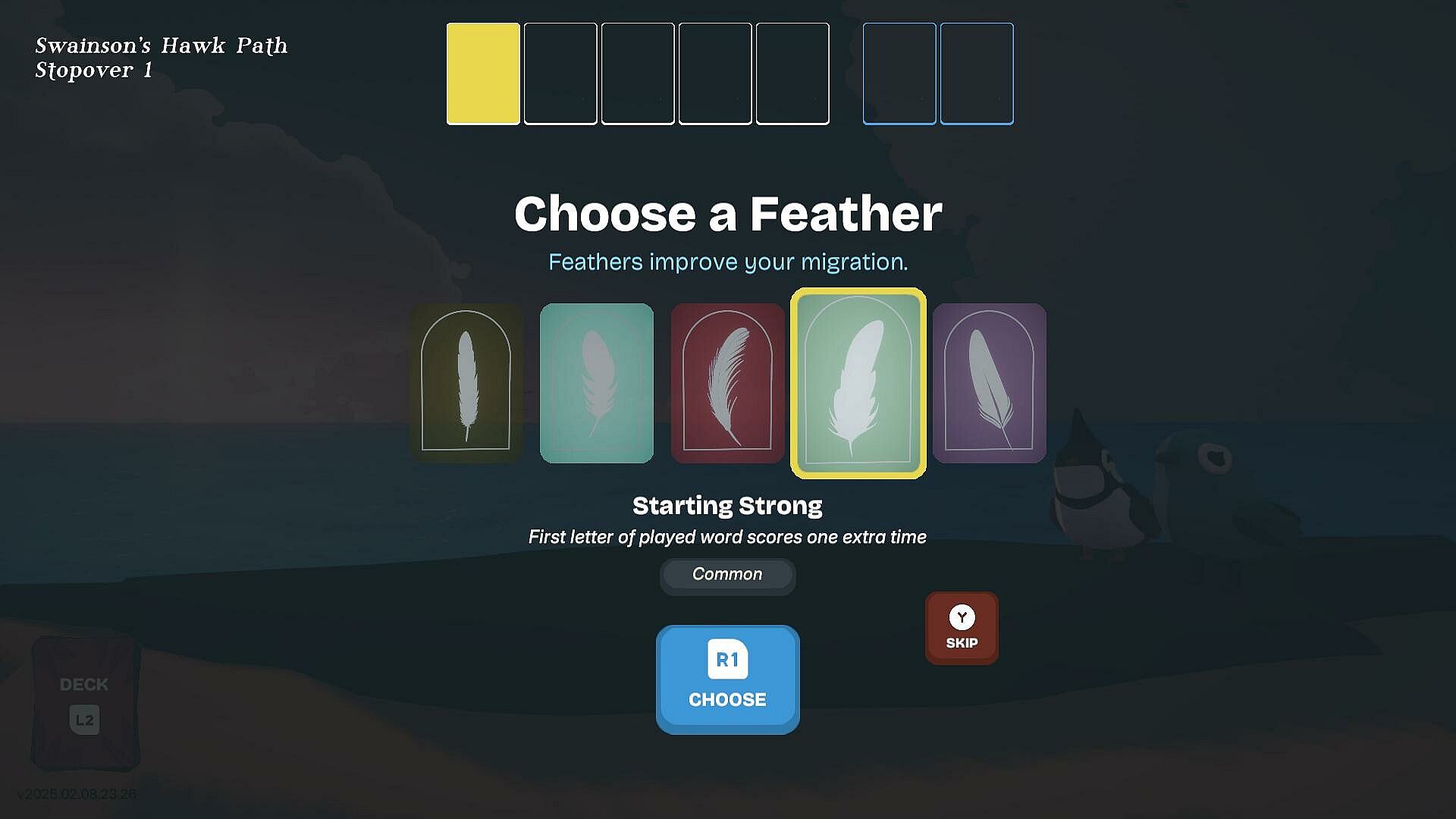 Assemble letter cards into words, which add up into āflapsā to send you further along your journey. Longer words score higher, but specific combos can turn short words into powerhouses. Use enchanted feathers, letters and songs to change the rules of the game as you go.