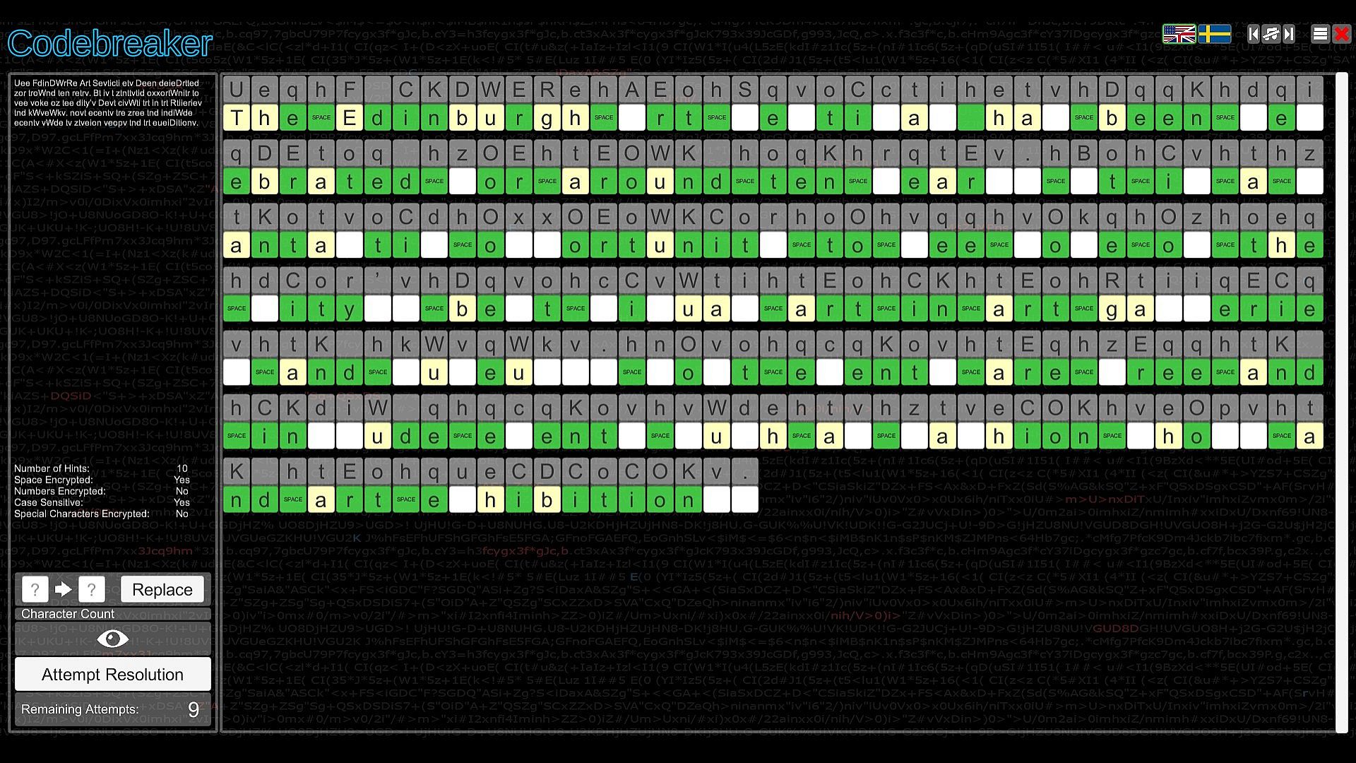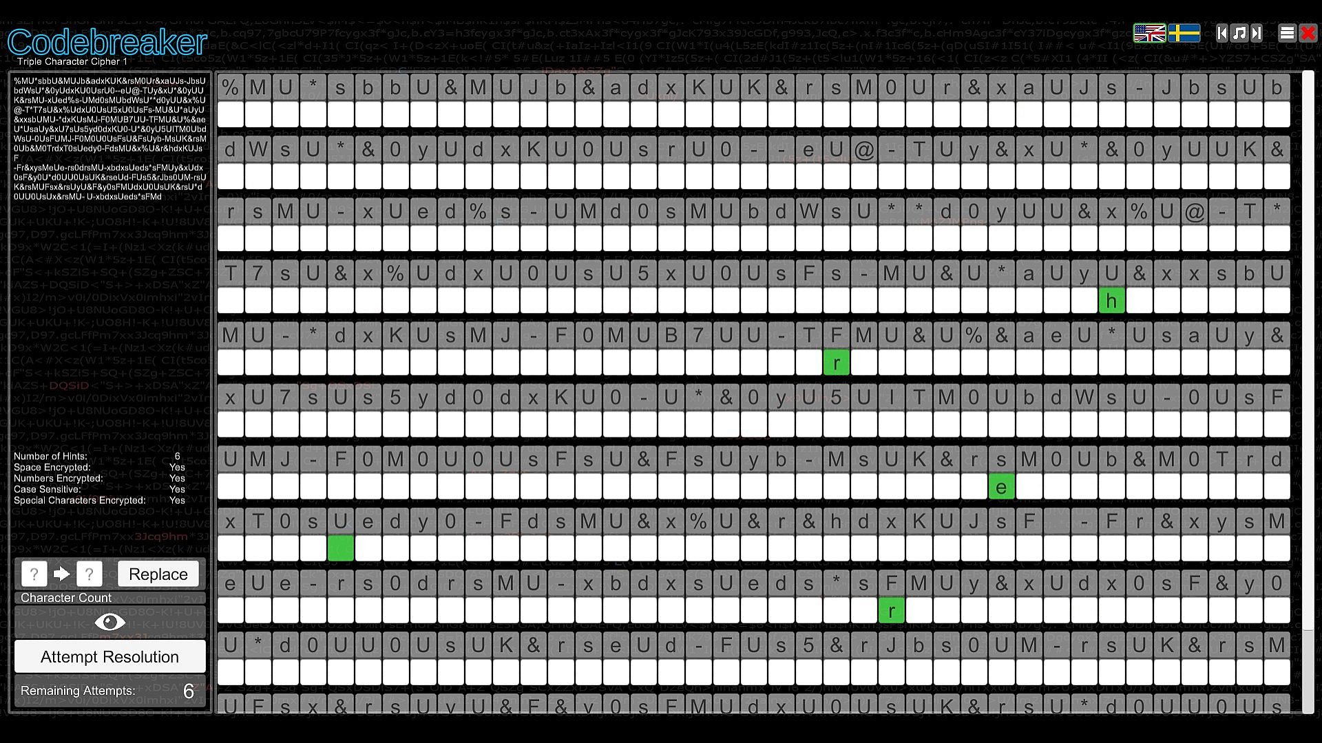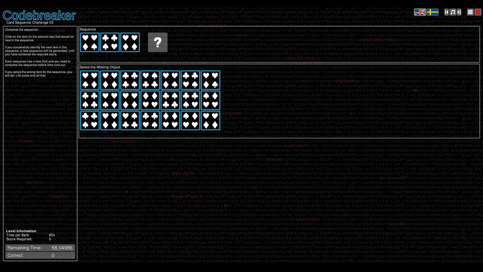 Test your intellect in Codebreaker, an indie casual puzzle game that challenges you to decode garbled texts by spotting switched characters, with hints to guide your start. Progress through the Character Substitution path and unlock others featuring Morse code translation, binary number representation, memory recall of strings with numbers, letters, or images, and sequence completion by identifying missing elements. Difficulty ramps up quickly across paths, demanding speed and coordination in select spots. This mind-bending experience suits analytical players who excel at pattern recognition and logic. Patience proves essential as challenges grow tougher, embodying the easy-to-learn, hard-to-master formula. Codebreakers with sharp deduction thrive here on PC.