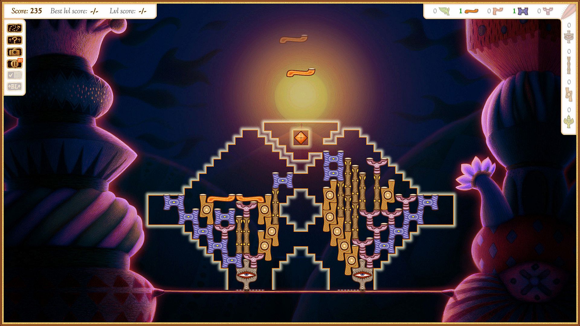 To solve successfully levels and get the maximum of them, you should first: choose the appropriate tactic, and second: wait for optimal blocks sequence (blocks appear randomly). Create the construction as optimal as you can to get more score items, which will gives you bigger score result and more Light. Some times you should destroy parts from the construction to open new possibilities and the most important, it gives you some chances to find valuable hidden items.