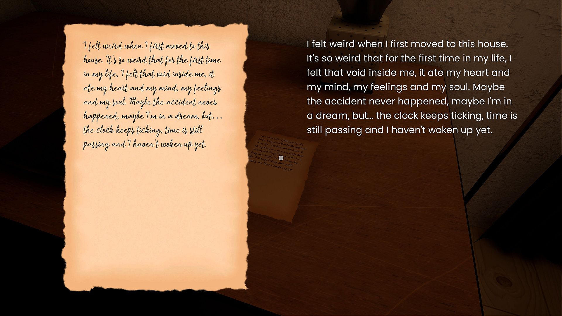 As a player you wake up after a very bad nightmare and you have to escape. The only way to escape is to use your mind to solve the puzzles throughout the game but it's not so easy, there is something there that is trying to stop you. You will have to find evidences, parts and other things to make your way out of that "thing" that is going on for a while. But in the end escape from where? your house? your neighbourhood? someone? you? There is only one way to find out.