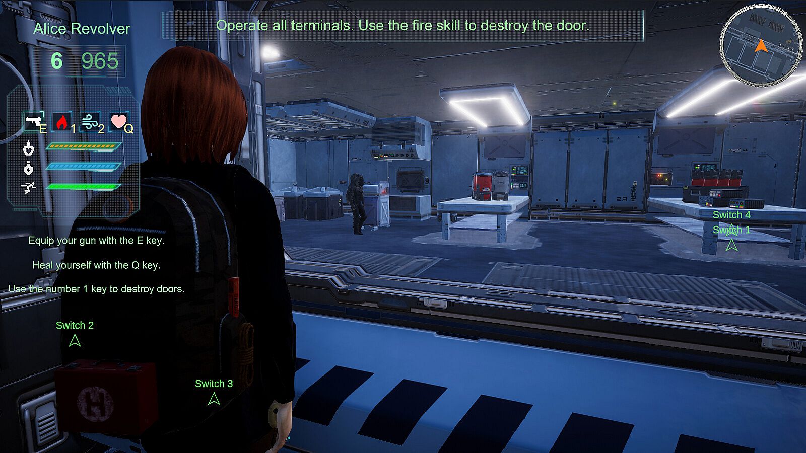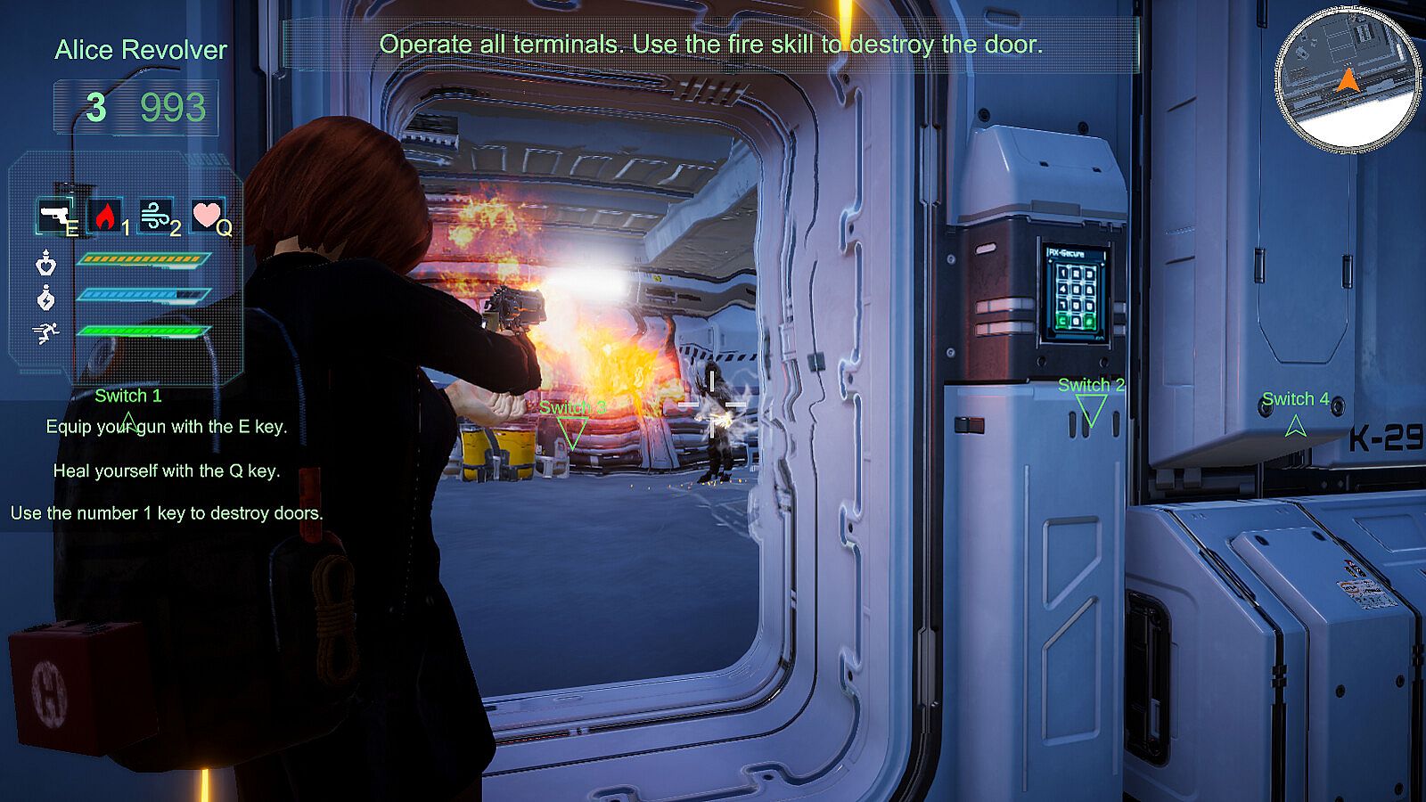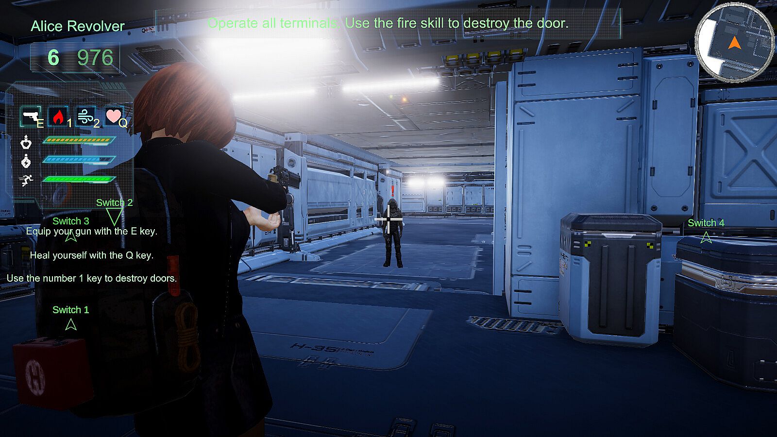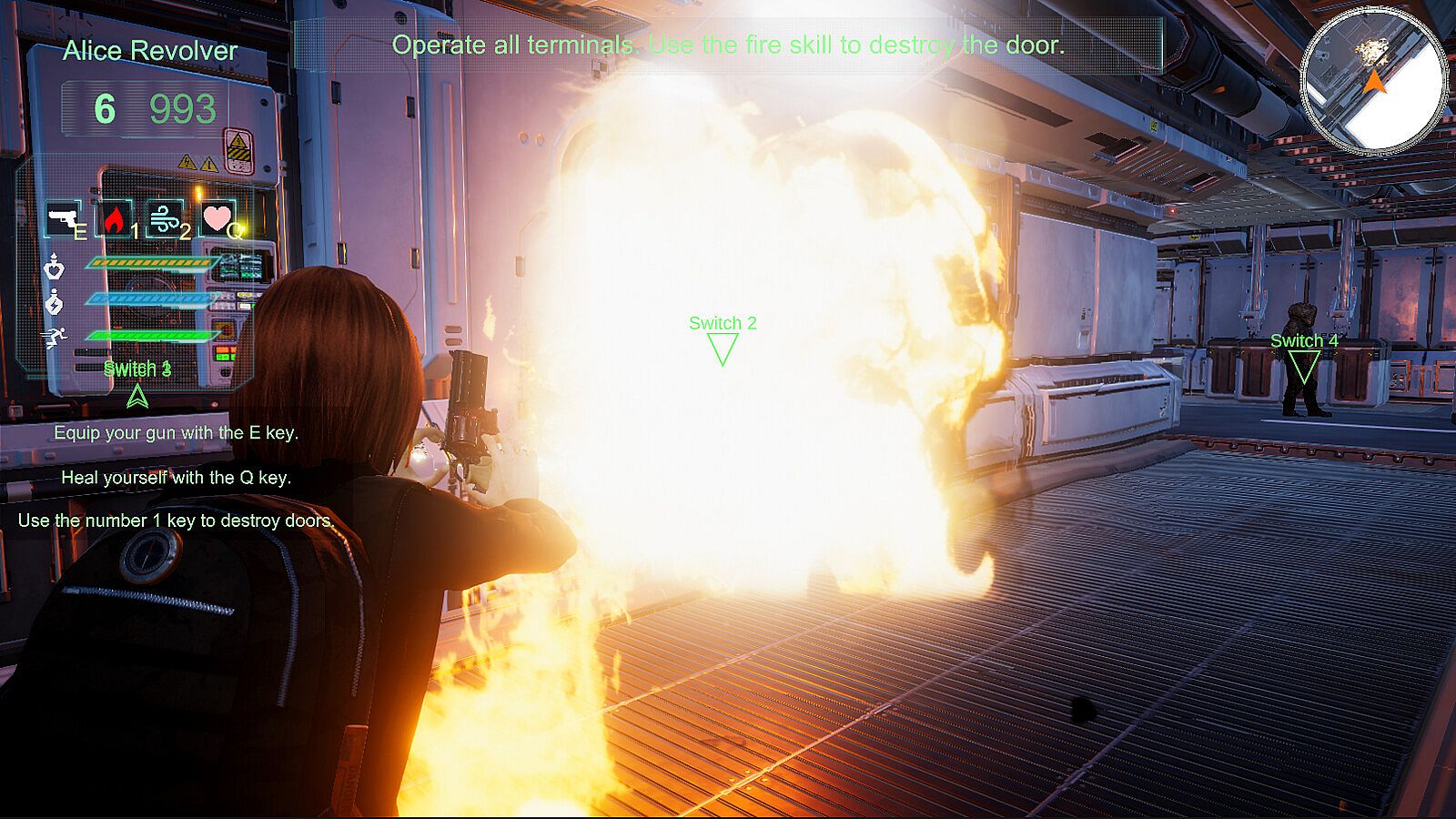 Defeat enemies with your gun. Alice can use skills, including destroying doors with a fire skill.