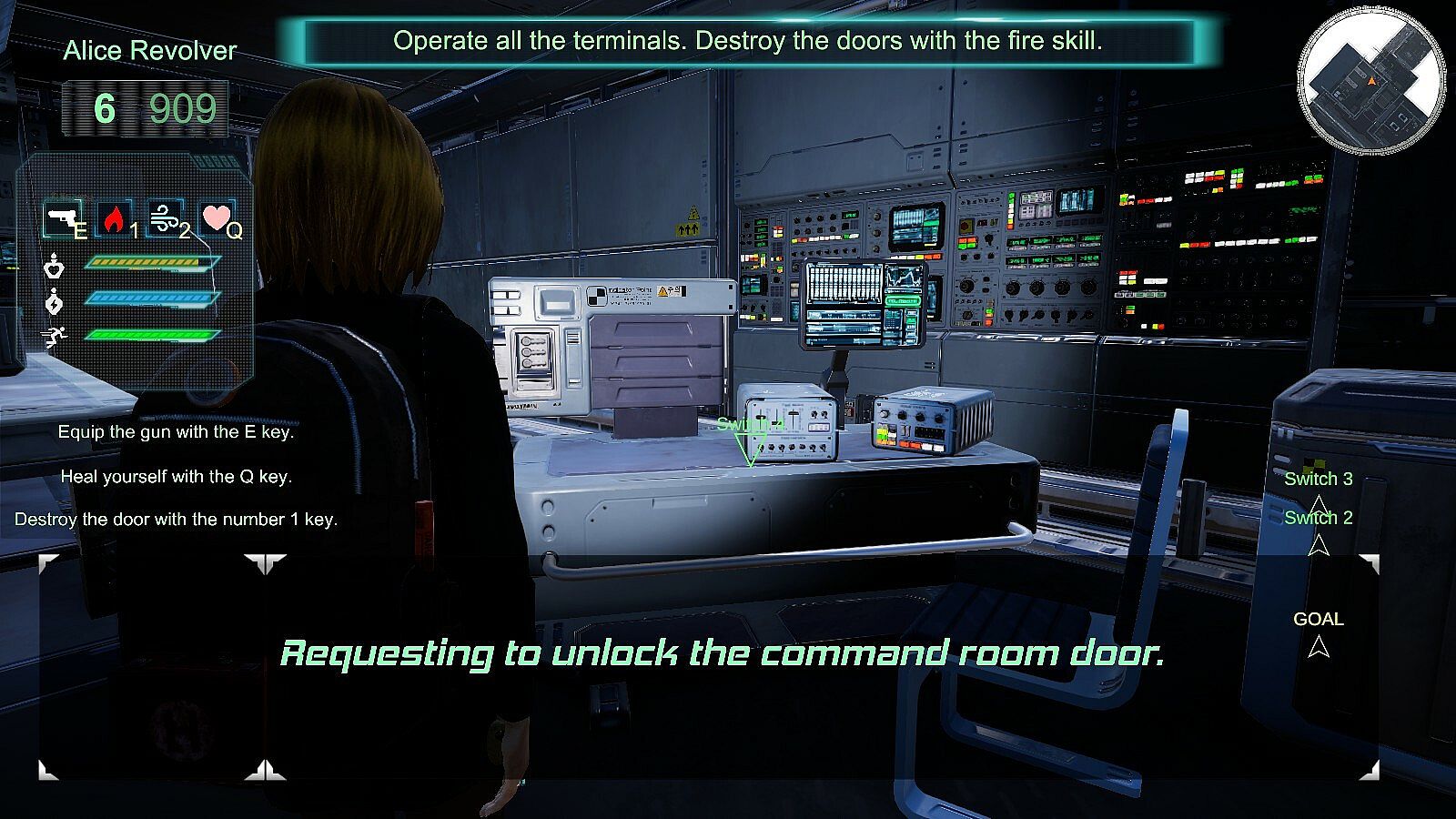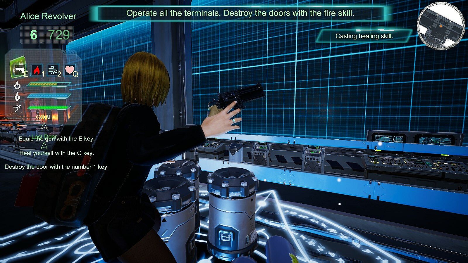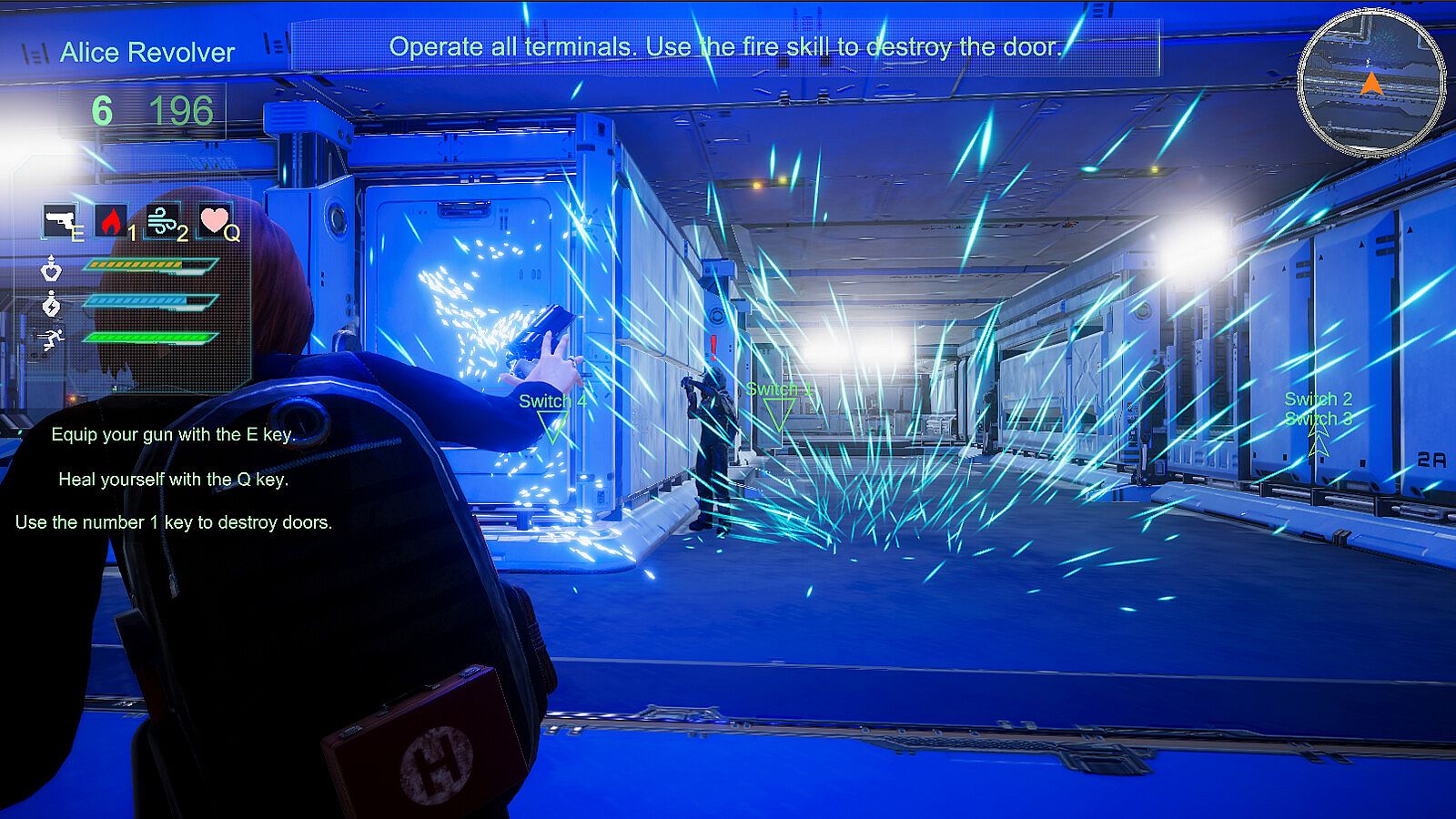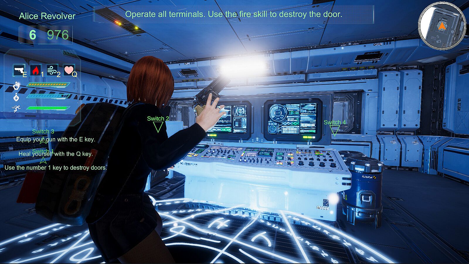 Defeat enemies with your gun. Alice can use skills, including destroying doors with a fire skill.