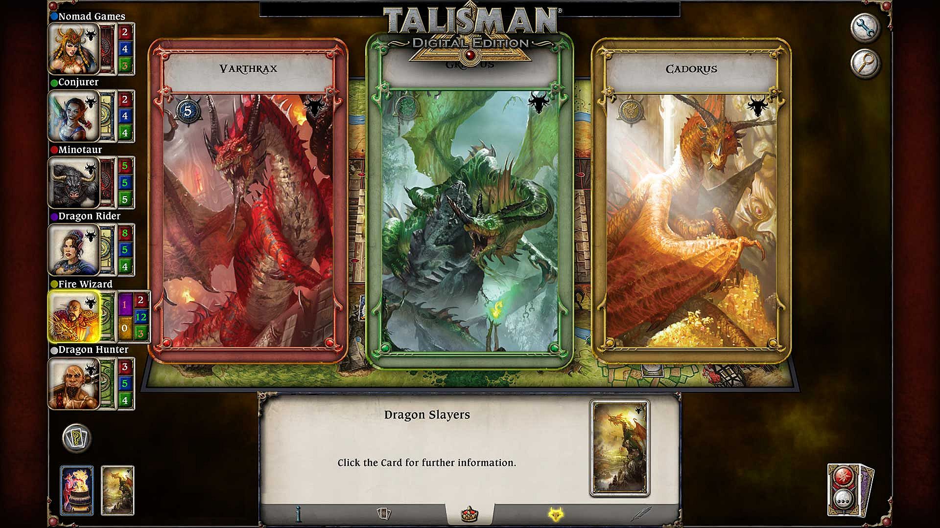 The three Dragon Lords, Varthrax, Grilipus and Cadorus, have returned to the land of Talisman. Each Dragon has a special ability called Dragon Rage, as well as having a dedicated Dragon deck. Each Deck consists of 56 cards featuring new Events, Enemies, Strangers, Objects, Followers and Places. Dragon cards run the risk of a character encountering a stronger than normal enemy, but the rewards you may gain are also of greater value.
