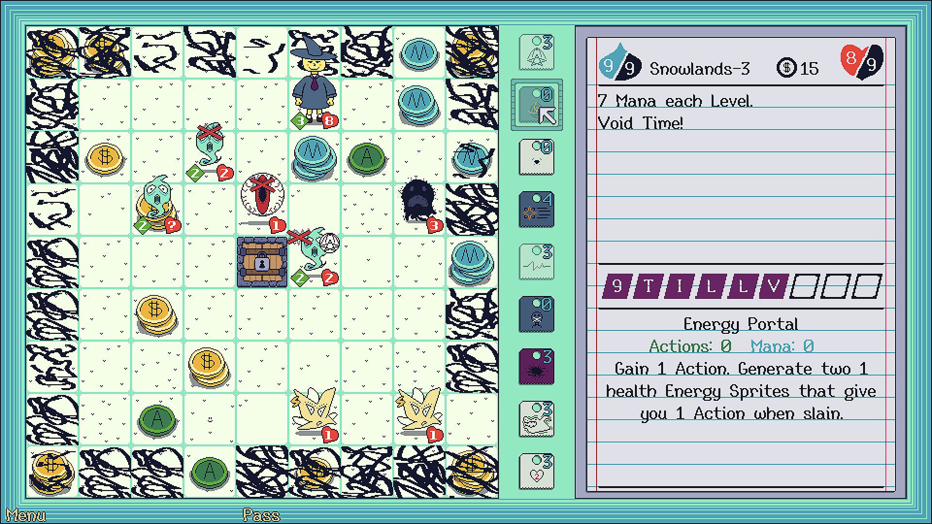 9 Till Void is played on a 9x9 grid, where each row correlates with one of your spell slots. You can only cast a spell if your character occupies the same row on the board as the spell, so your position always matters.