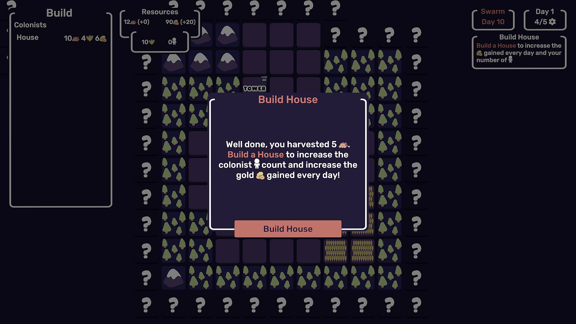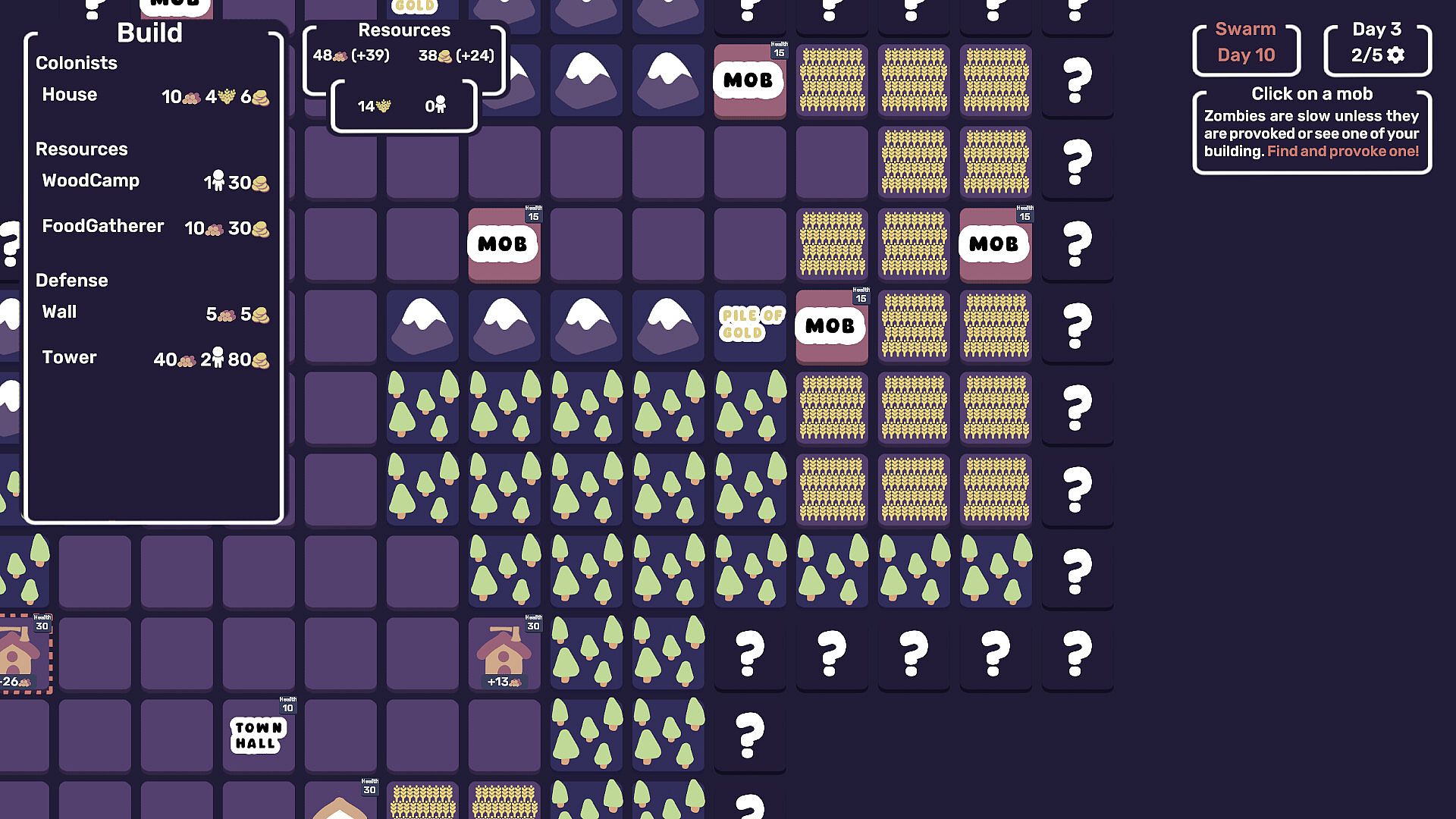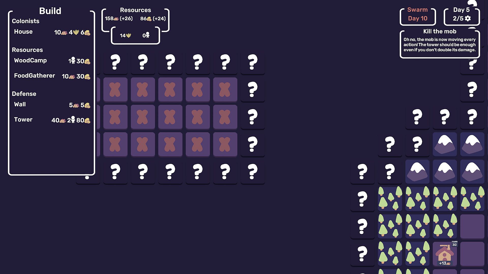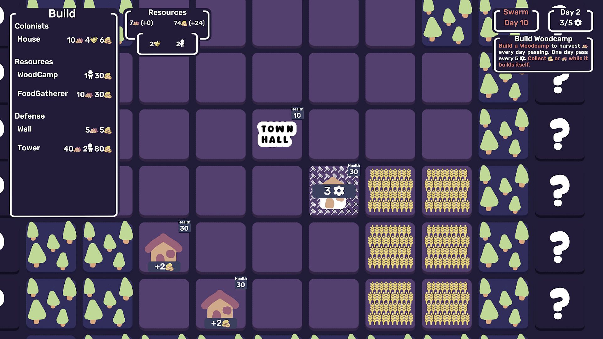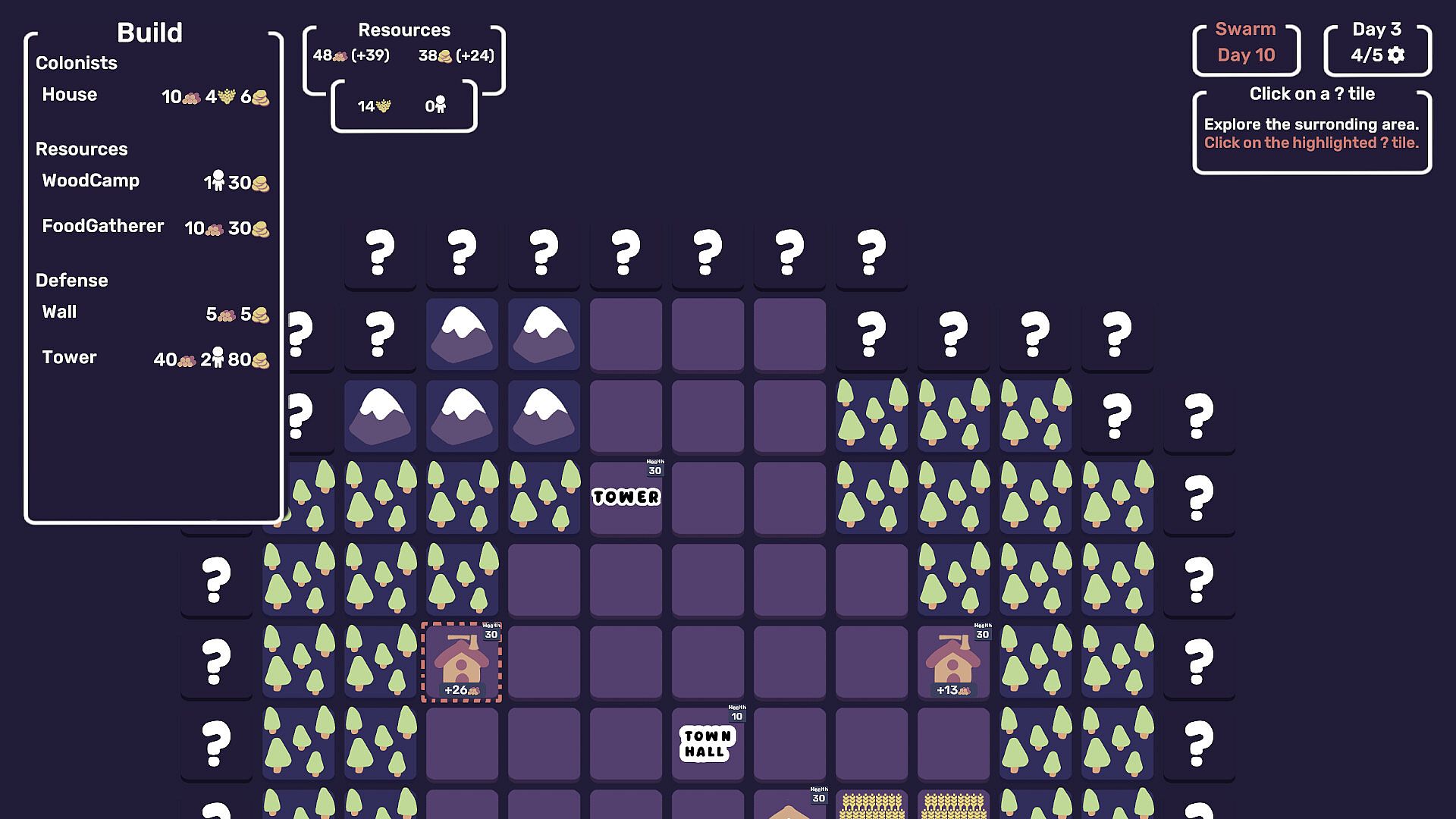 Each day, you are given a limited number of actions to carefully construct buildings, explore, gather resources, and reinforce your defenses. Every decision matters—do you invest in food production or do you prioritize settings up your defenses to prepare for the next wave?