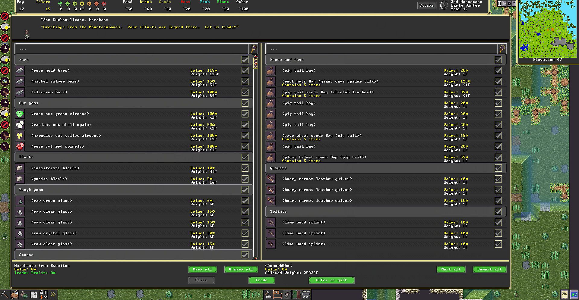 It’s difficult to convey the depth of the generation. Hundreds of animals and monsters, many of which are randomly created for each world, as well as generated poetry, musical forms, instruments, and dances for your dwarves to practice and perform. A dynamic weather model tracks wind, humidity, and air masses to create fronts, clouds, storms, and blizzards. Over two hundred rock and mineral types can appear, in their proper geological environments.
