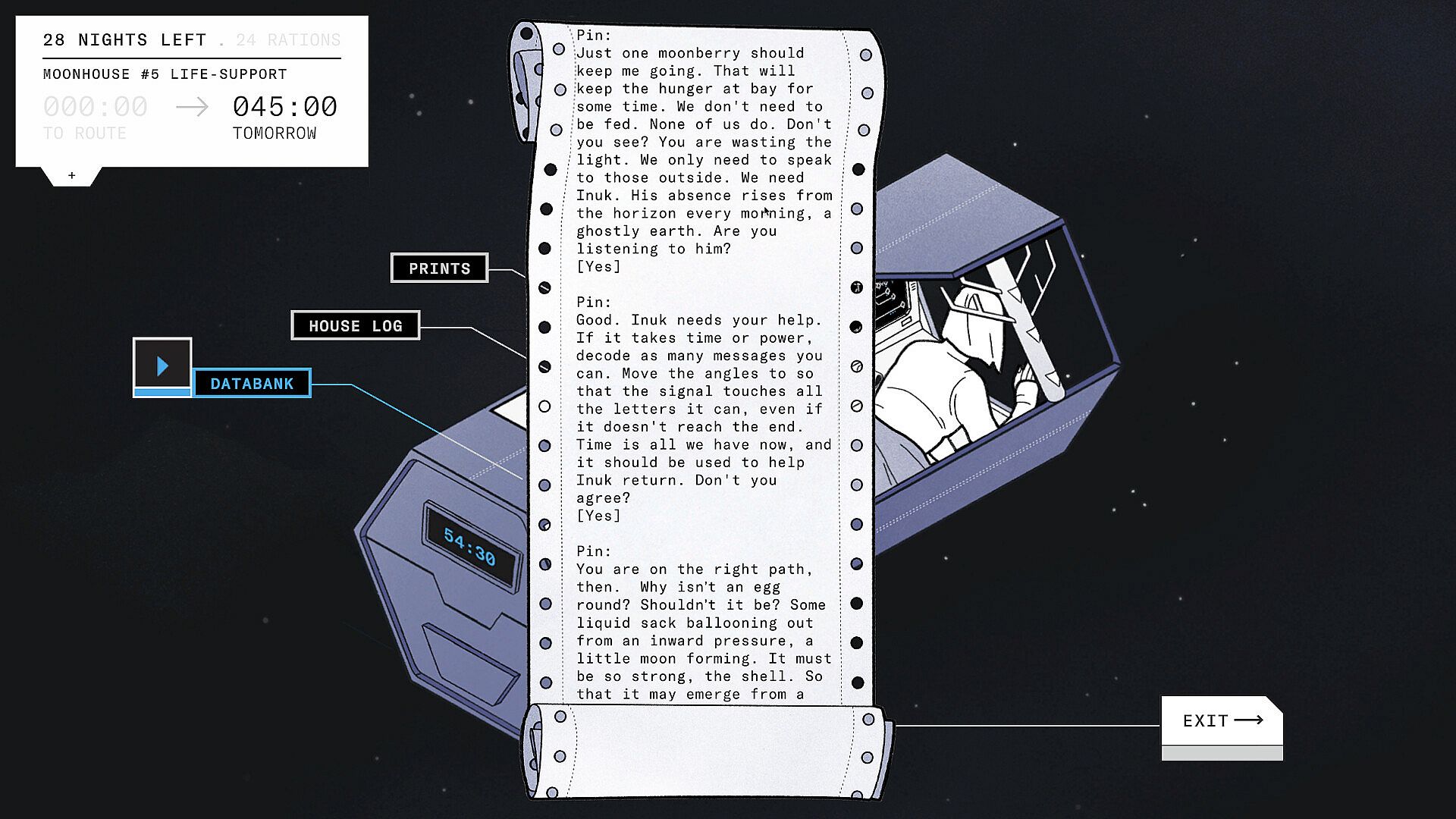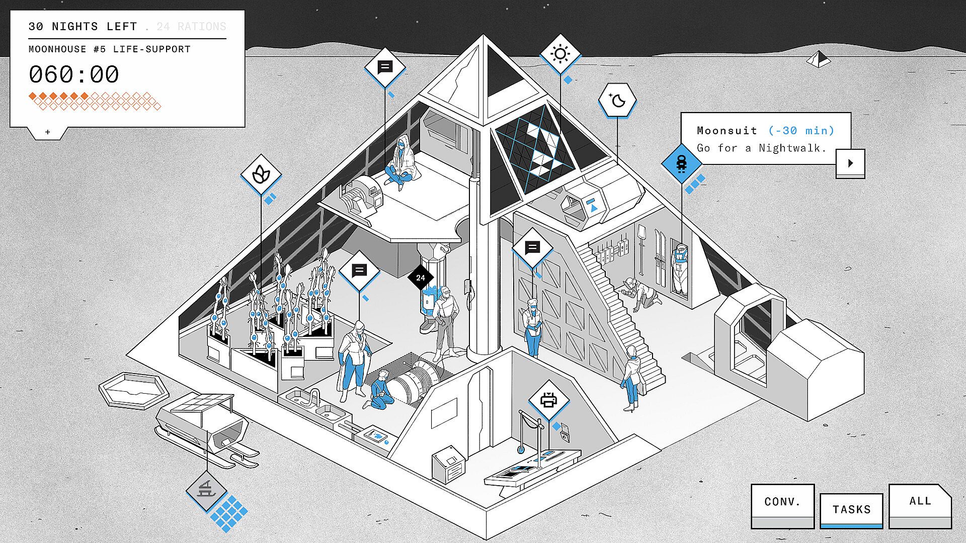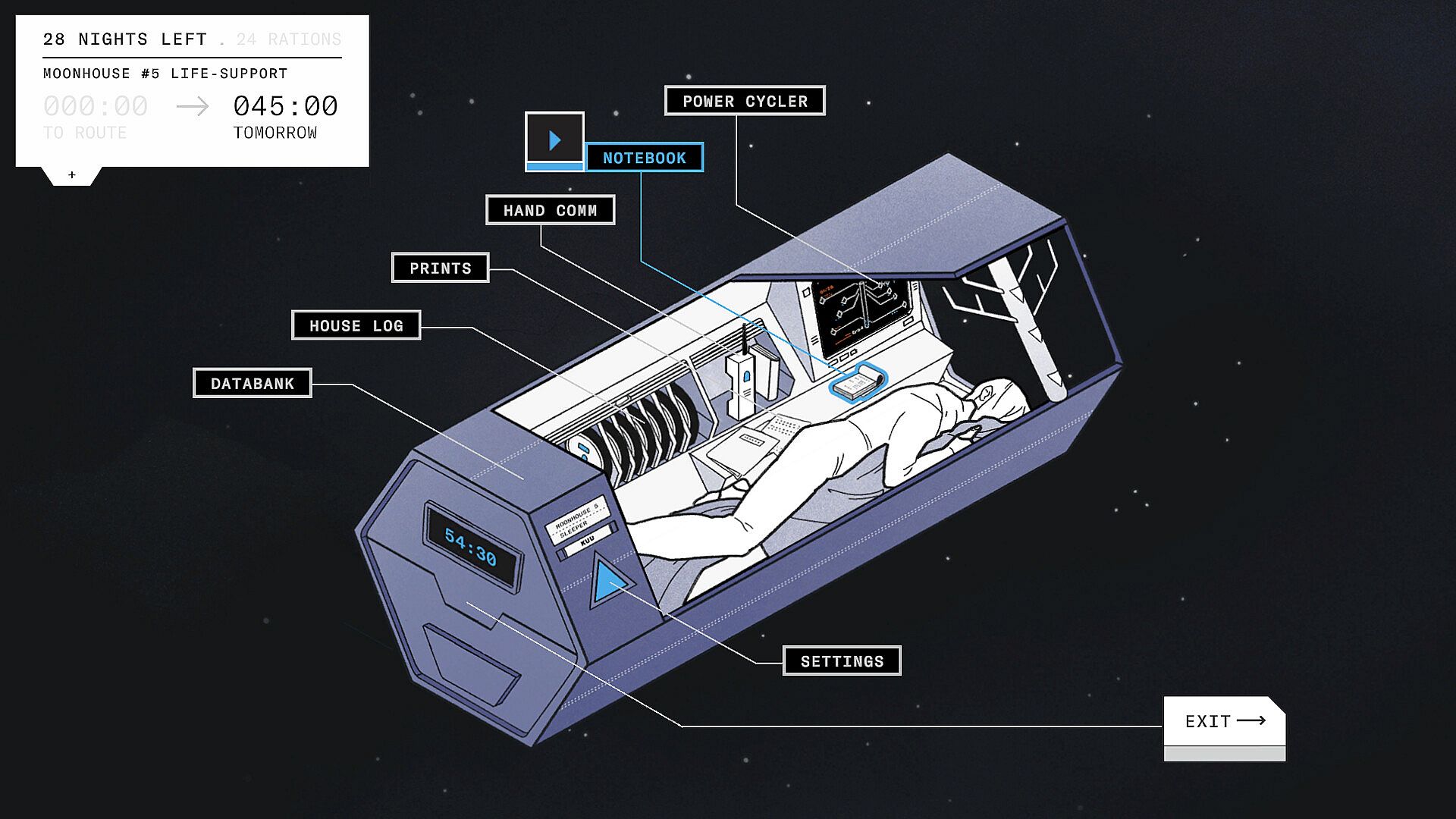 After a mysterious blast from a long-abandoned Earth disables the moonhouse, the difficult decisions begin. You have precious little time and must choose what tasks are vital. Do you puzzle the solar panels together for maximum yield, download more documents in your search for clues, or use the comm desk to decipher some remote hope of rescue? It’s a fragile ecosystem, and time is not on your side.