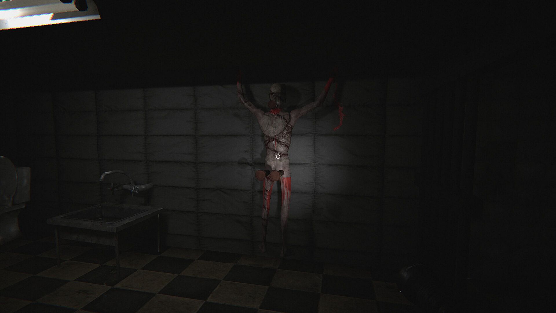 Environmental Storytelling: Objects and wall writings deepen the absurd dark comedy atmosphere.