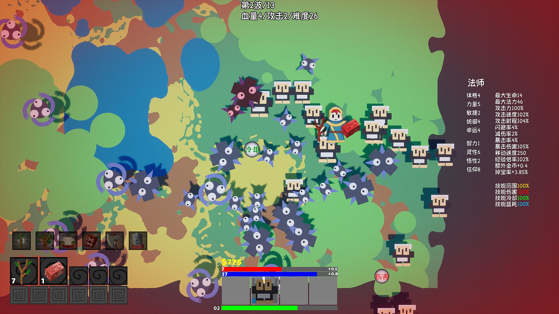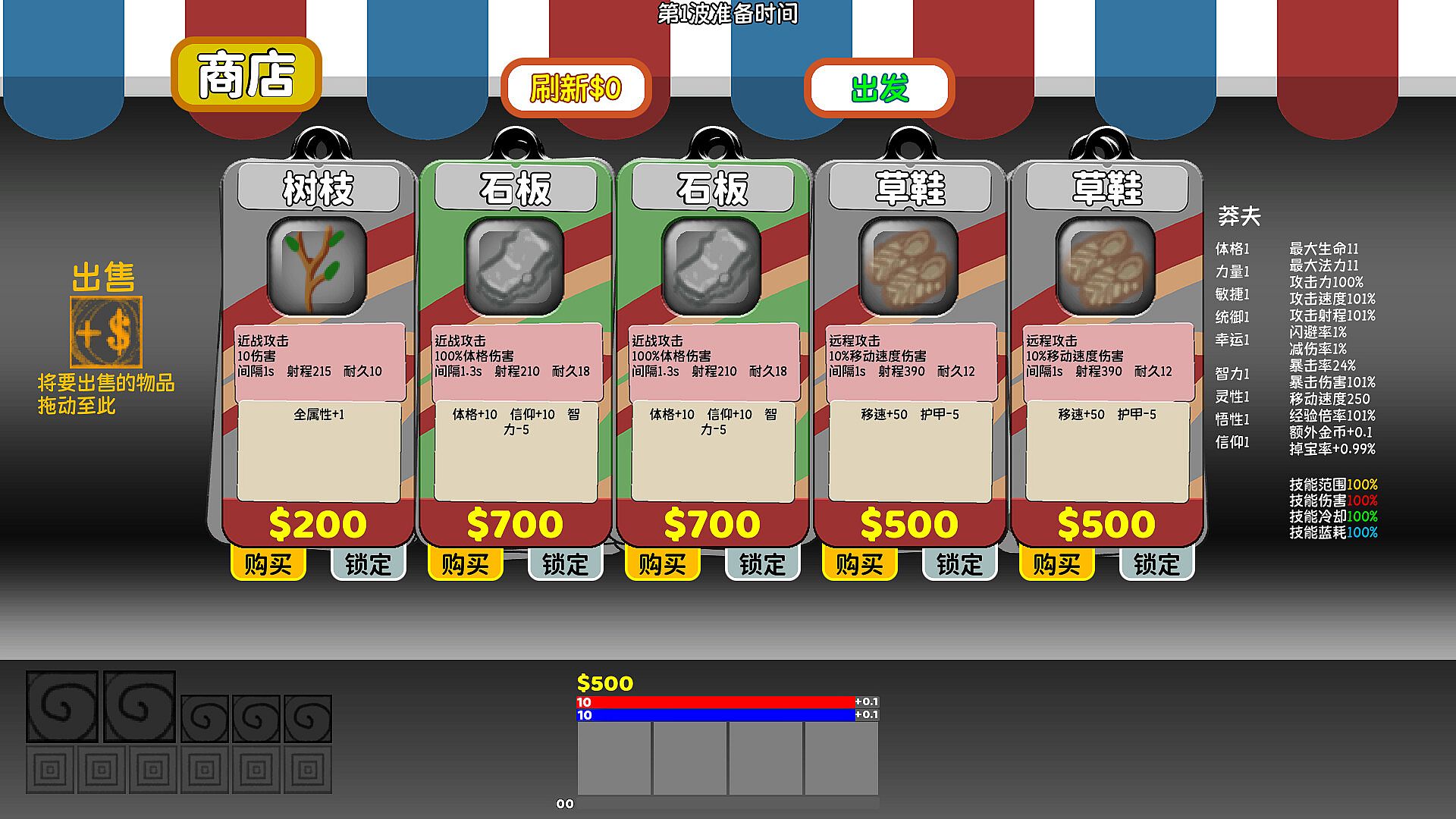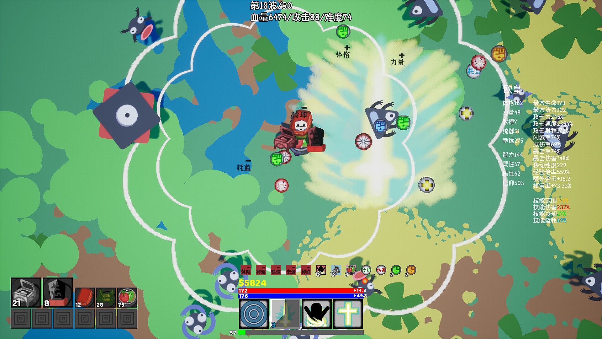 First, choose your character to start an adventure, and buy items at the beginning of each adventure. The items in the store can also be synthesized into advanced items. In the process of adventure, the character will upgrade the level, and with the upgrade of the level, the character will finally select four skills to improve the combat ability. Monsters will get stronger and stronger with the number of waves. In this process, you need to selectively improve your ability to complete all the adventures.