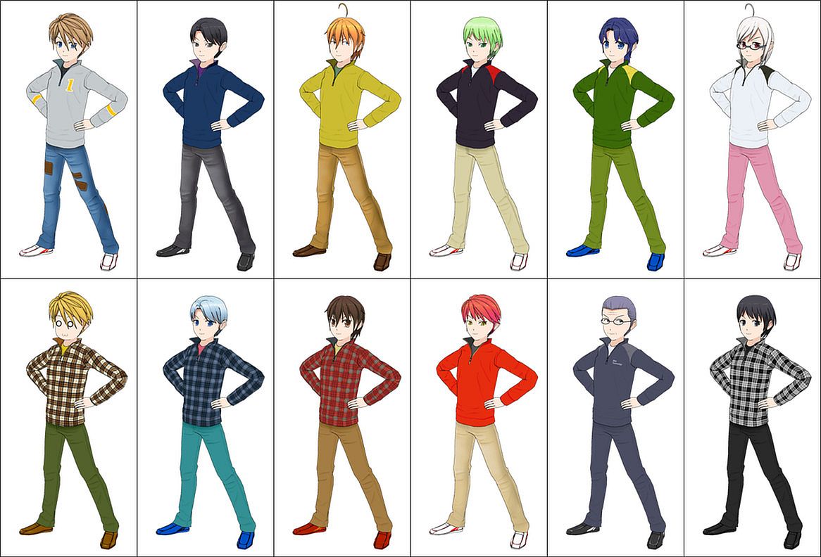 This pack contains 44 sets of clothing, divided equally between male and female. A large variety of clothing is provided, ranging from skirt fashions to long-sleeve styles to camouflage outfits! You can use these outfits for scenes that take place outside of school, where your uniform-free characters are able to relax and express their personality. Let their looks shine with unique styles and favorite colors. These classic styles can also be used for older or younger supporting characters, as they are appropriate for many walks of life.