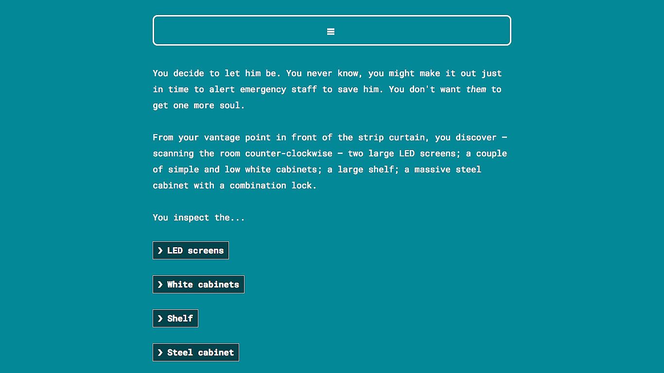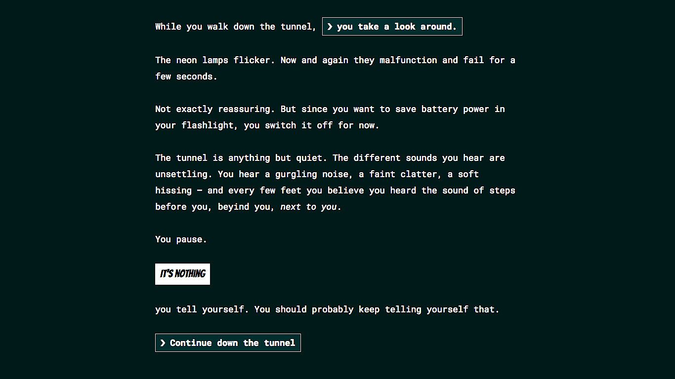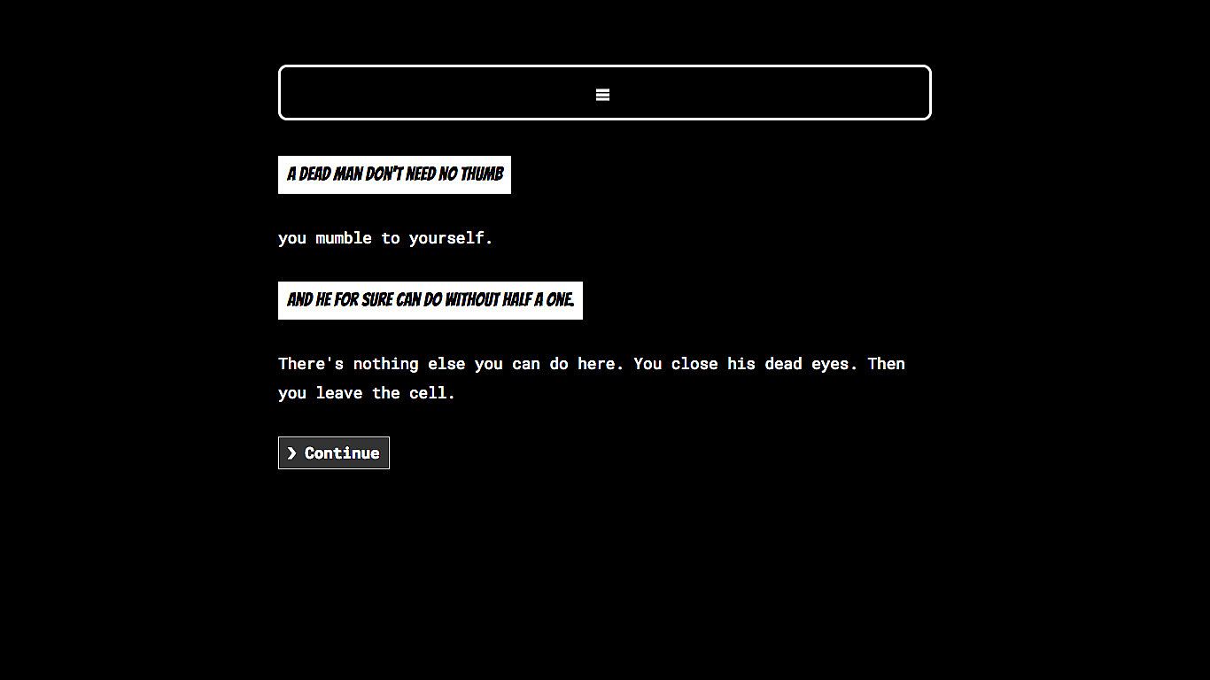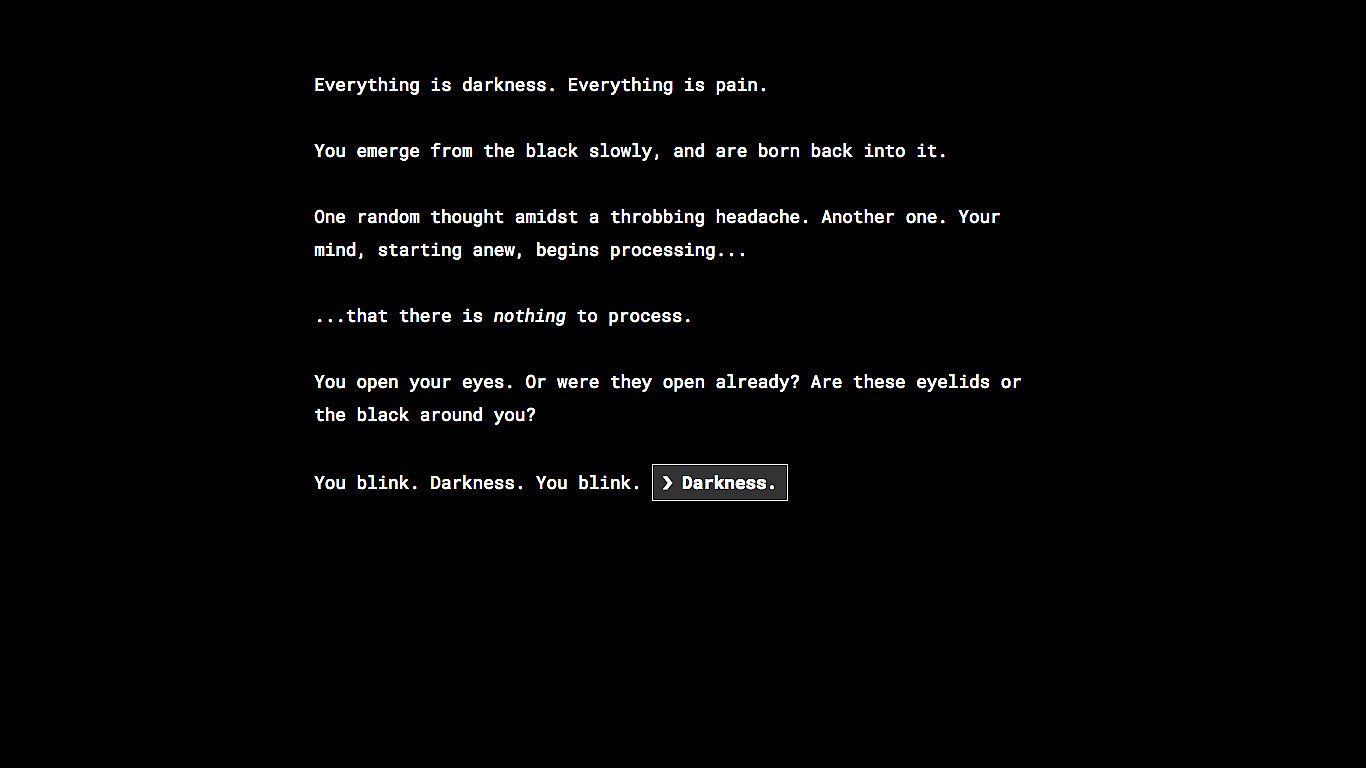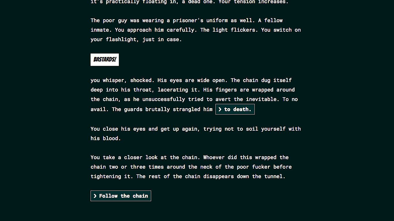 A choice-based game slash novel, you try to escape from an underground prison complex – all the while suffering from amnesia, fighting off guards seeking your death, and slowly unravelling the mystery that brought you to this place, as you traverse the thin line between survival and revenge…