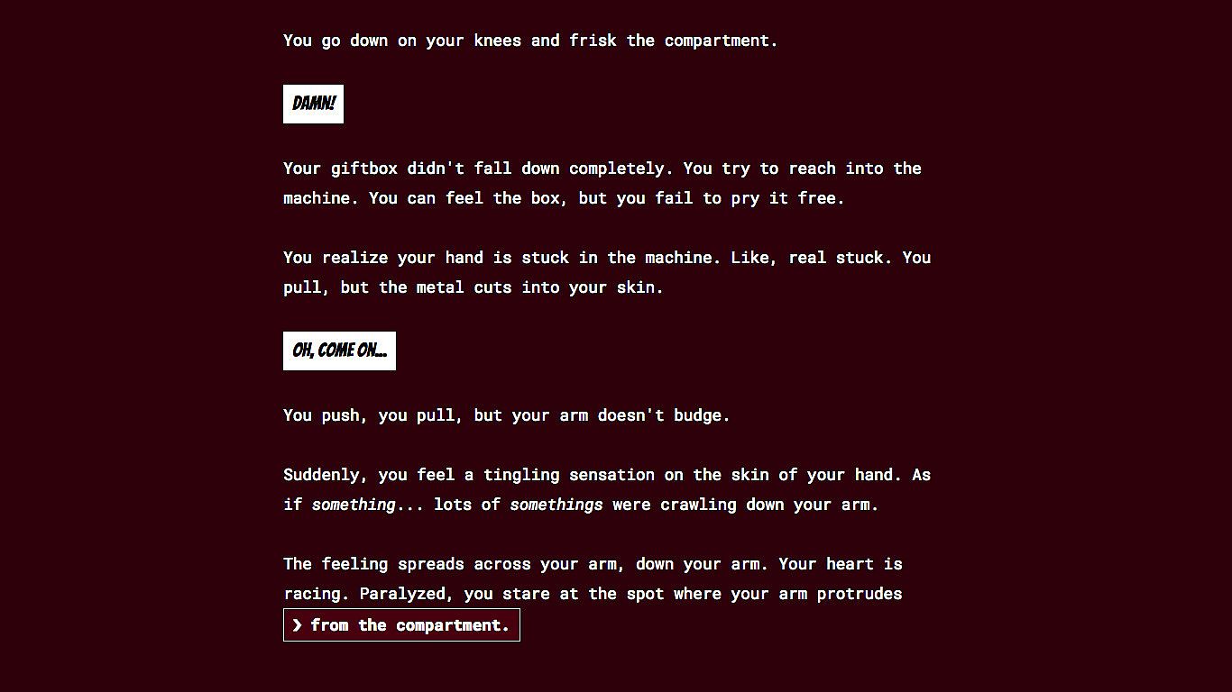 Imagine a horror novel where you get to make the choices and decide how the story plays out: Welcome to American Angst, a text-based multiple-choice survival horror interactive fiction, combining RPG elements and turn-based combat with dark humor and satire.