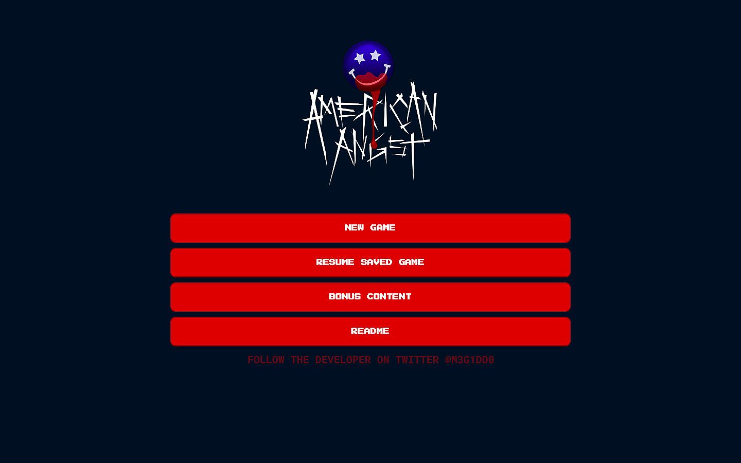Created with Twine by M3G1DD0 aka Misha Verollet (@m3g1dd0 on Twitter), American Angst is an interactive fiction in the vein of Choose your own Adventure and Fighting Fantasy games.