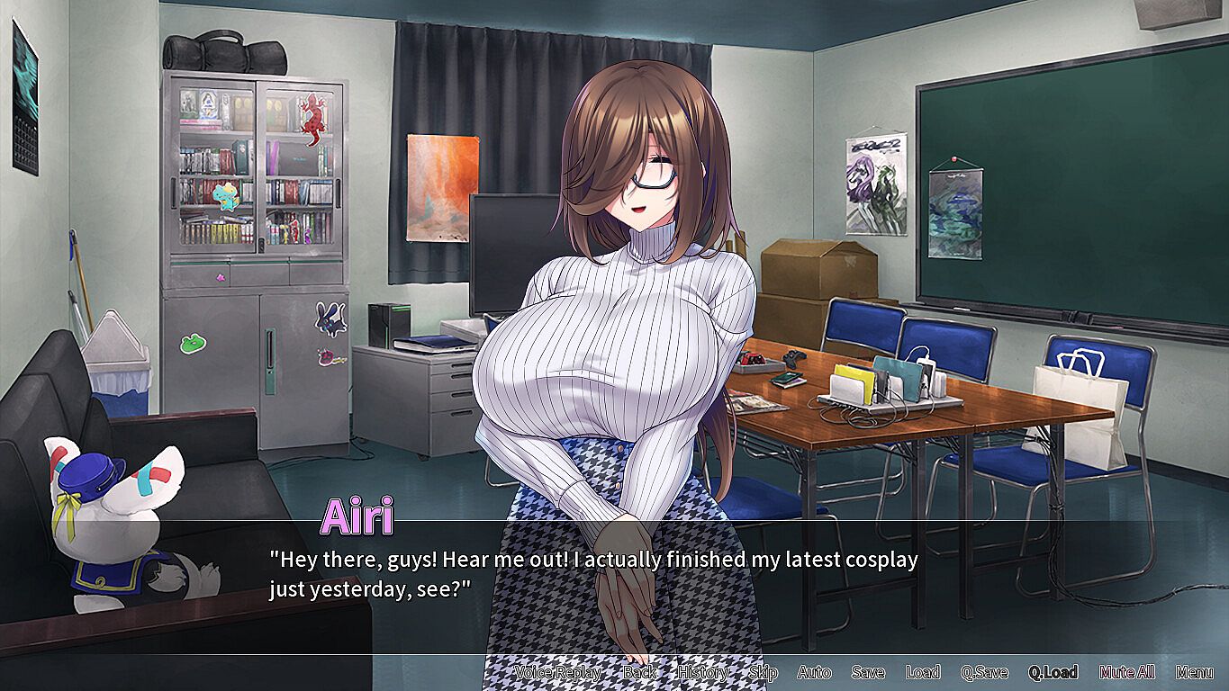 Your moment arrives one day as you're heading to the club room. You’ve left some potent dirty mags behind, but there’s a surprise when you go to retrieve them. Airi in full Ponpoko cosplay, face flushed redder than her outfit, quietly skimming through the exact hentai you were trying to grab!.