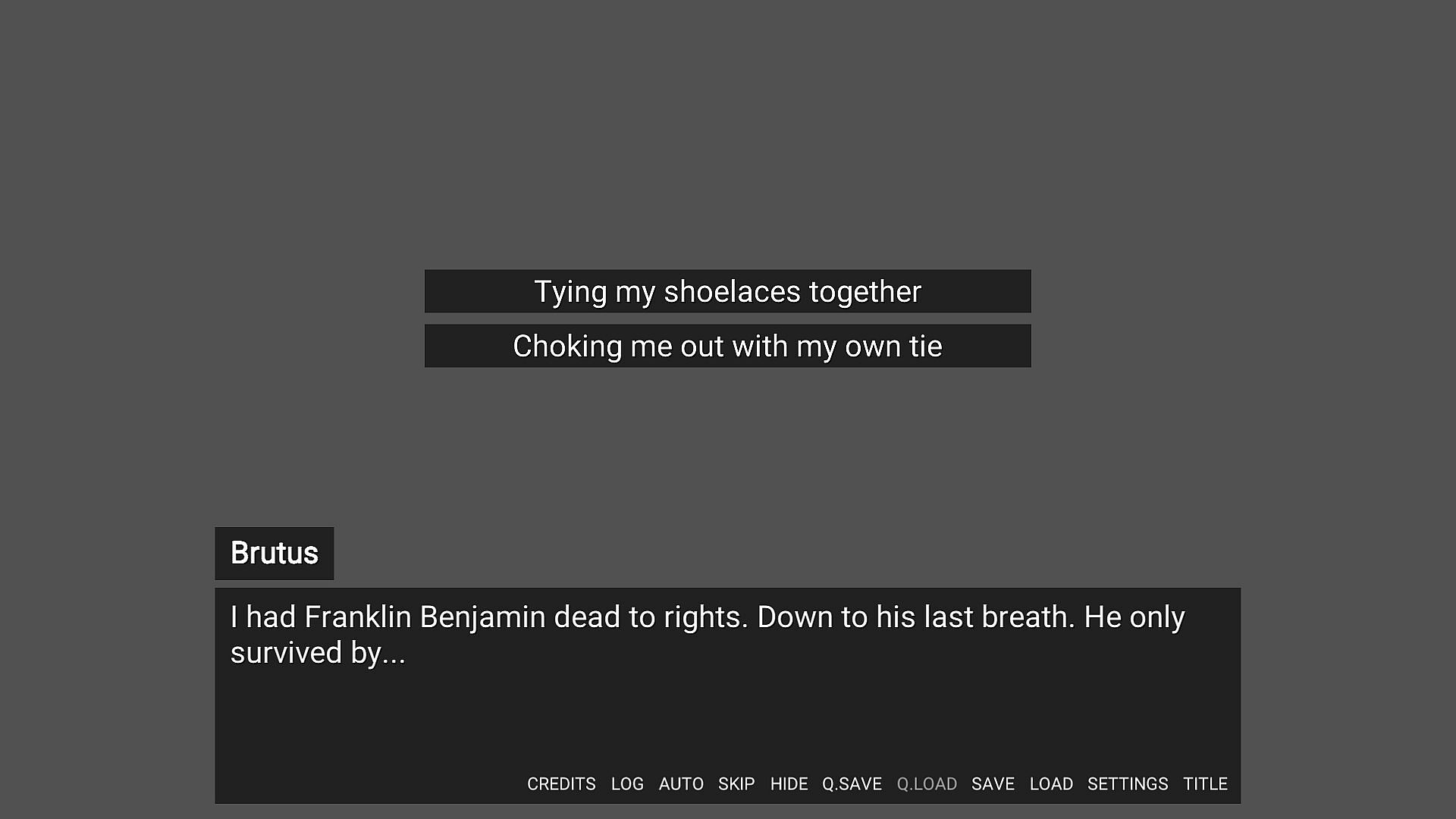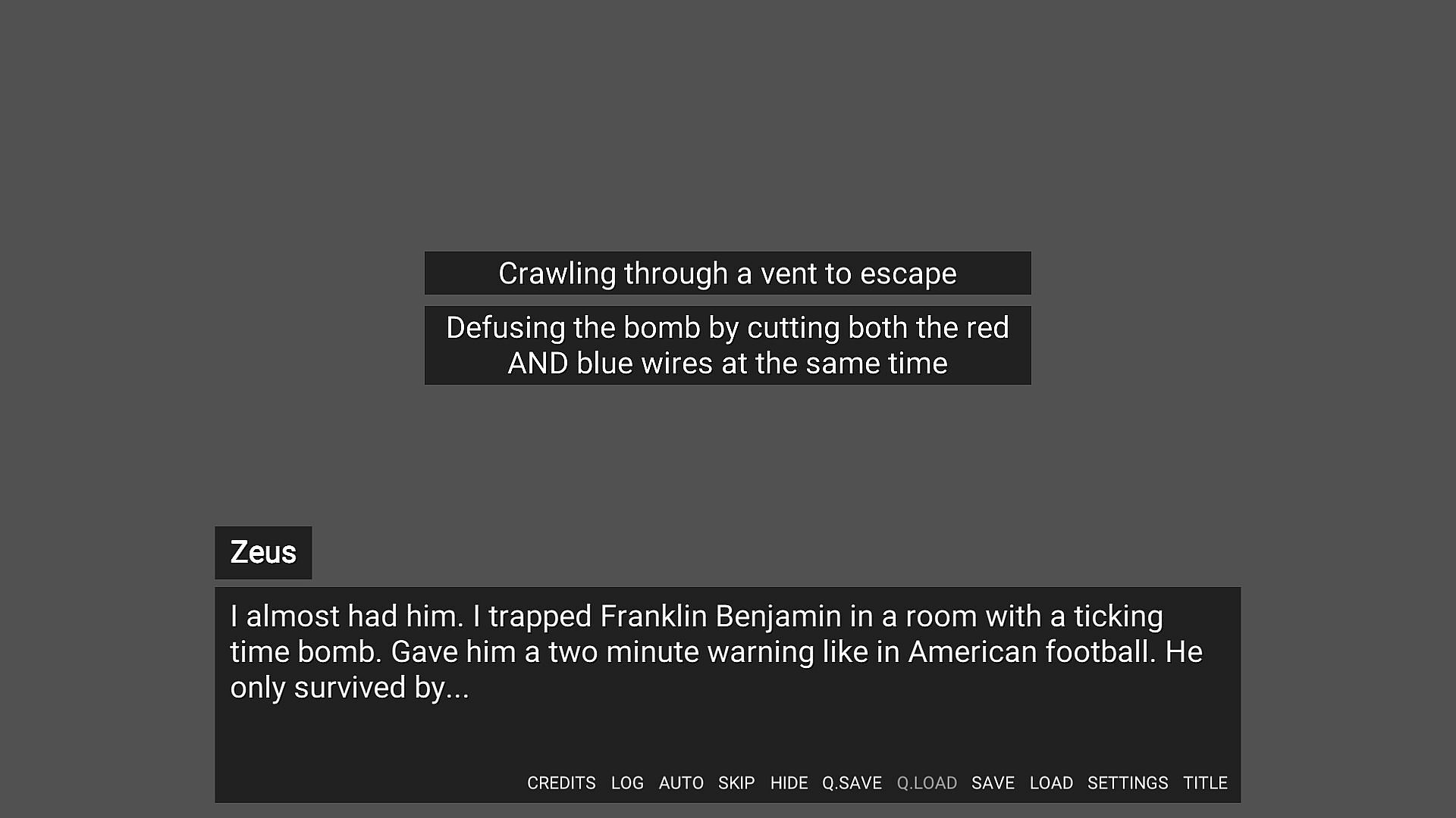 There's Always A Madman: V.I.C.T.O.R. aims to be about the length of a movie for a single playthrough (roughly two hours). During that time, you may very well have to do some not-so-nice things to succeed. But that's okay - as they say, nice guys finish last. And you've had enough finishing last against the great secret agent Franklin Benjamin