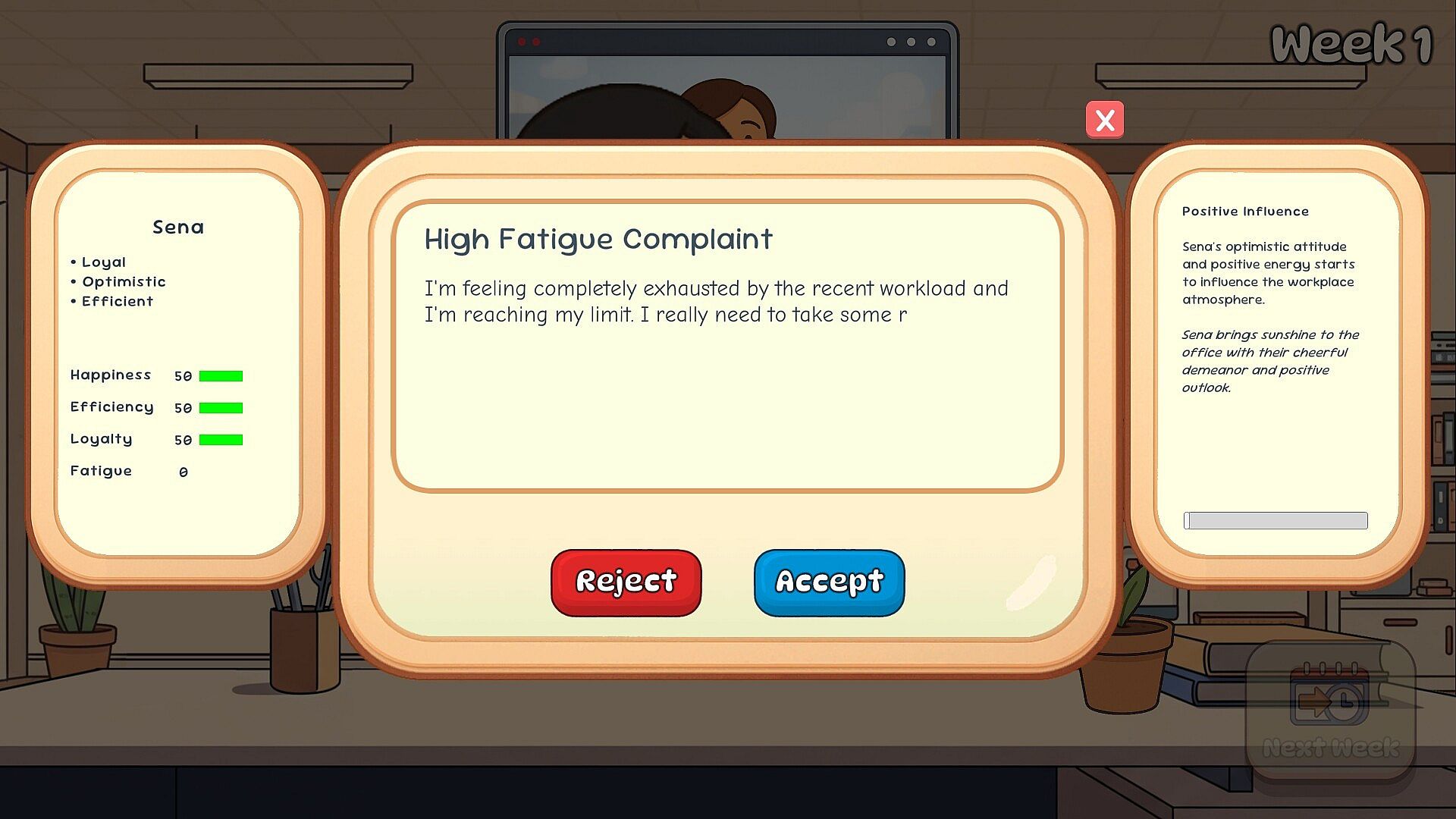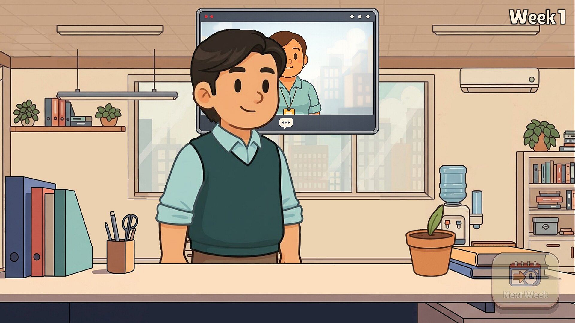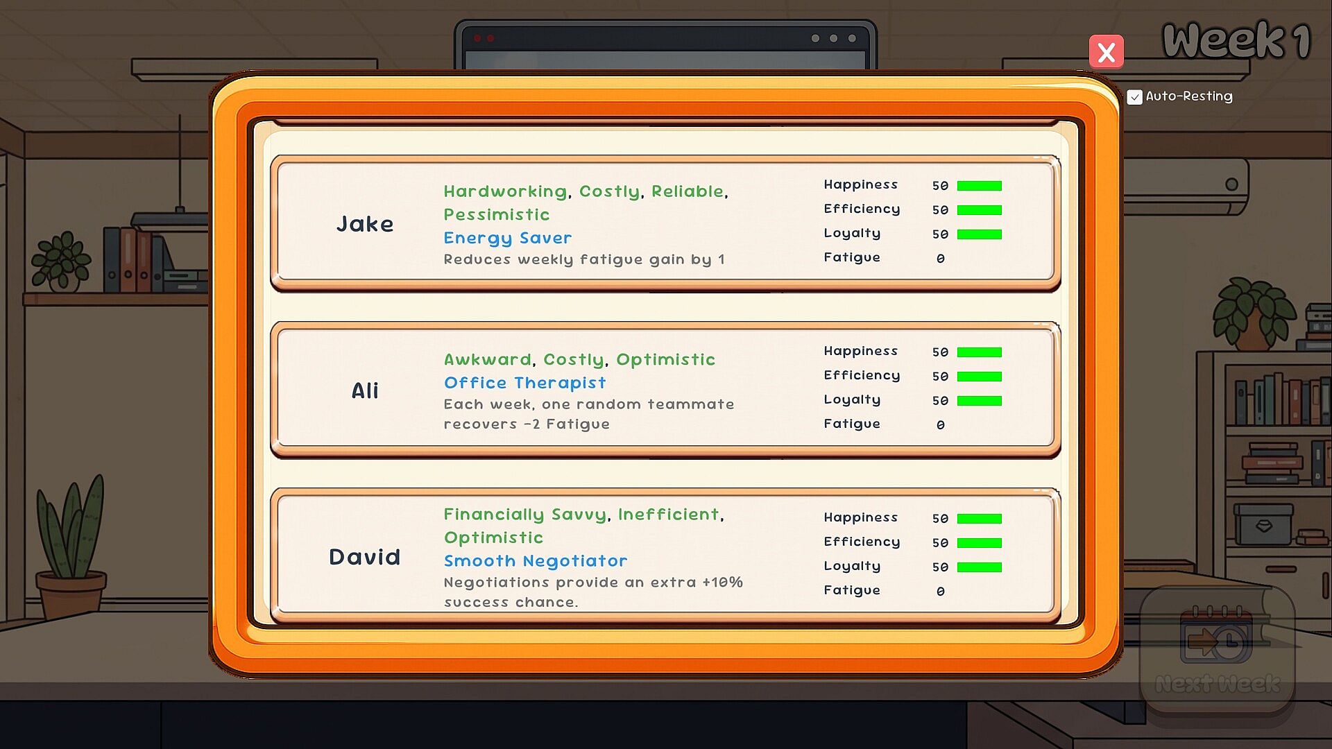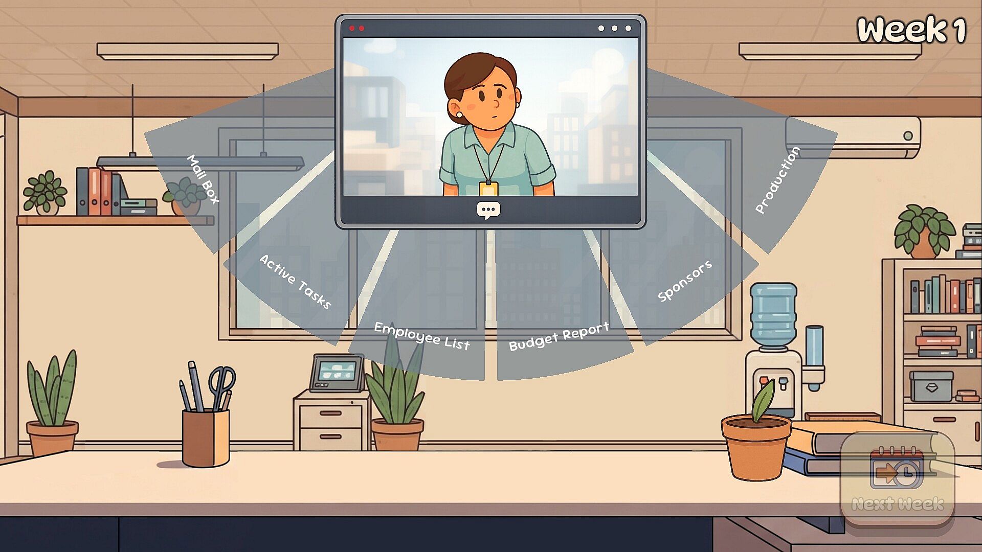 • Take charge of a small but chaotic office. Manage your team, deal with incoming requests, and try to keep the budget afloat throughout a single 52-week game cycle. The game progresses on a weekly basis, and the decisions you make each week have lasting consequences.