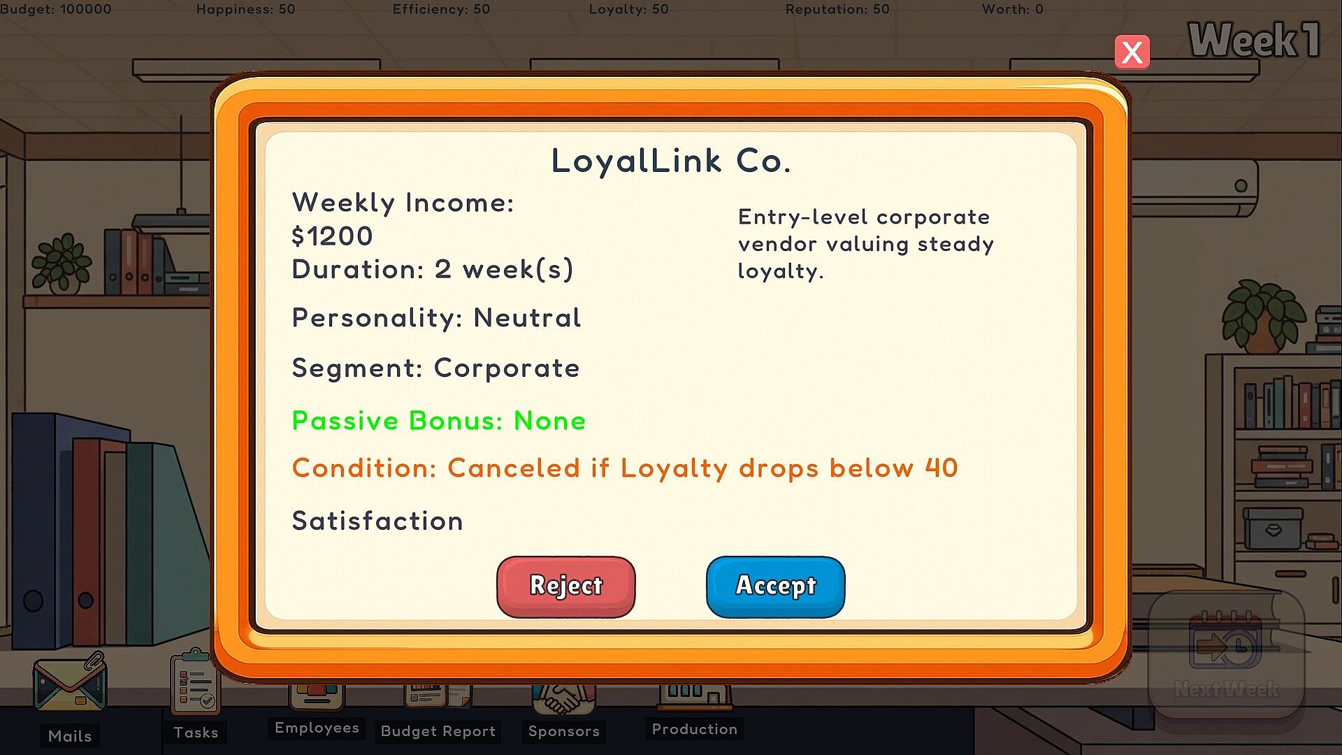 • The tasks you encounter are randomly generated but not entirely out of your control. Each week brings different tasks and requests; solve them by assigning employees, spending the budget, using external resources, or postponing them. Each solution method has different effects on KPIs, the budget, employee statistics, and future events.