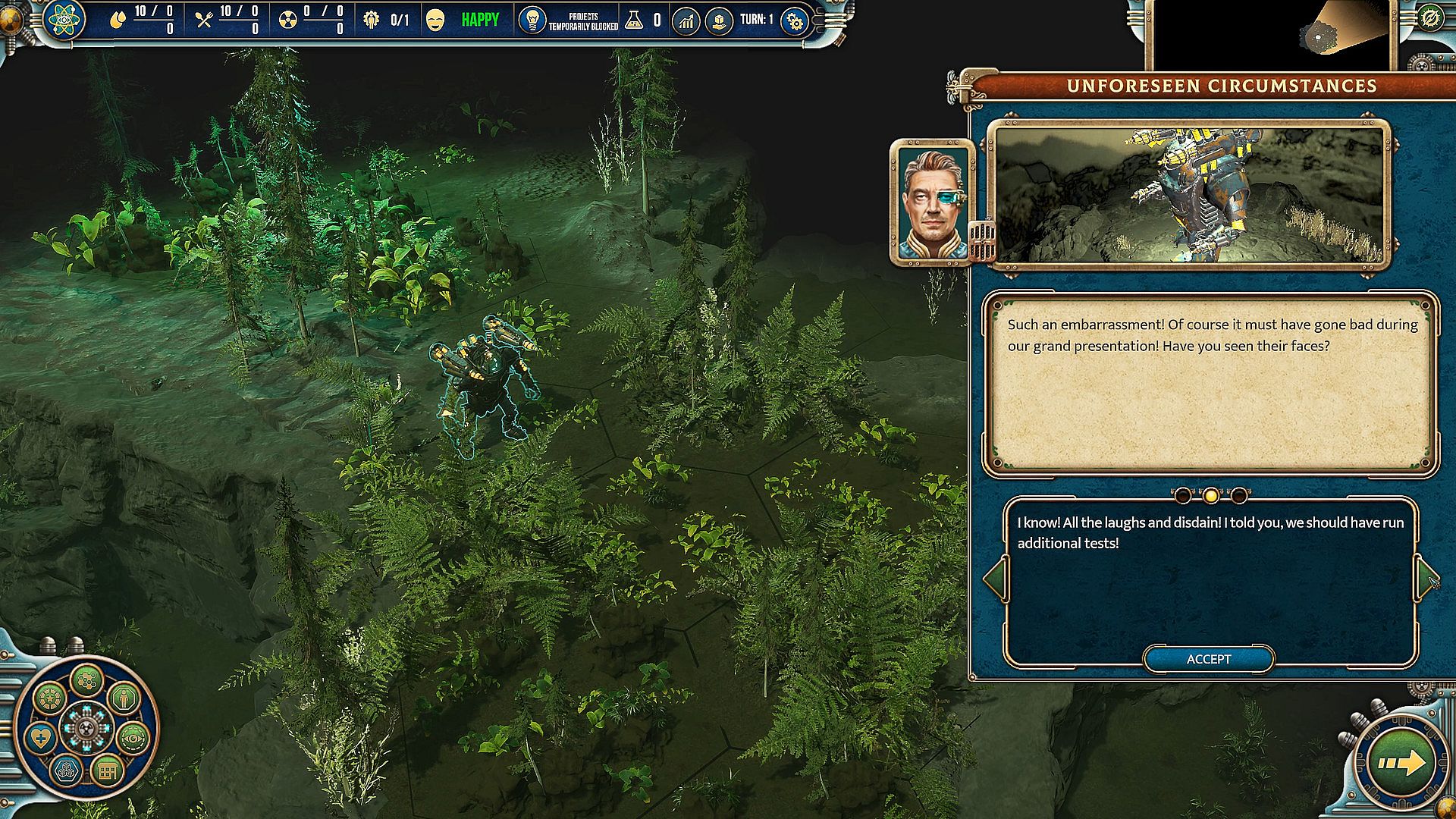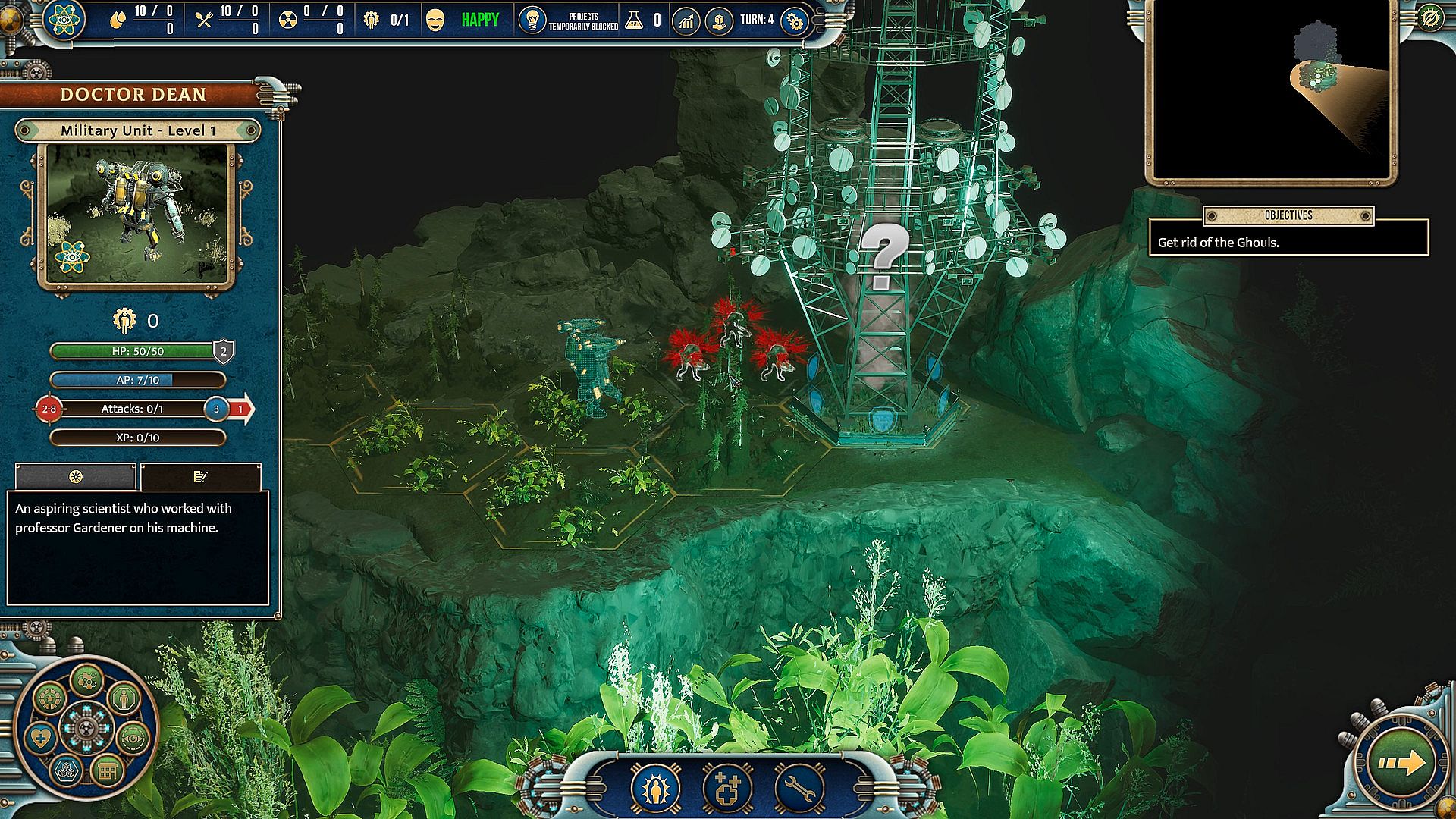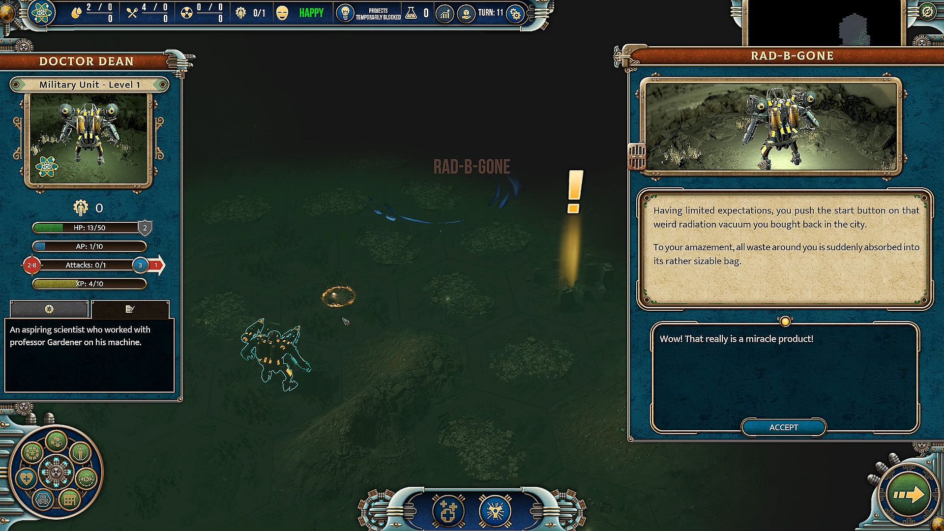 As an assistant of professor Gardener – one of the most brilliant minds of Atompunk – you spent years working on a machine capable of cleansing contaminated grounds. The most important members of the Atompunk Science Community gather to witness the grand presentation of your life's achievement, but when the show is about to start, something goes wrong, and the machine remains unresponsive…