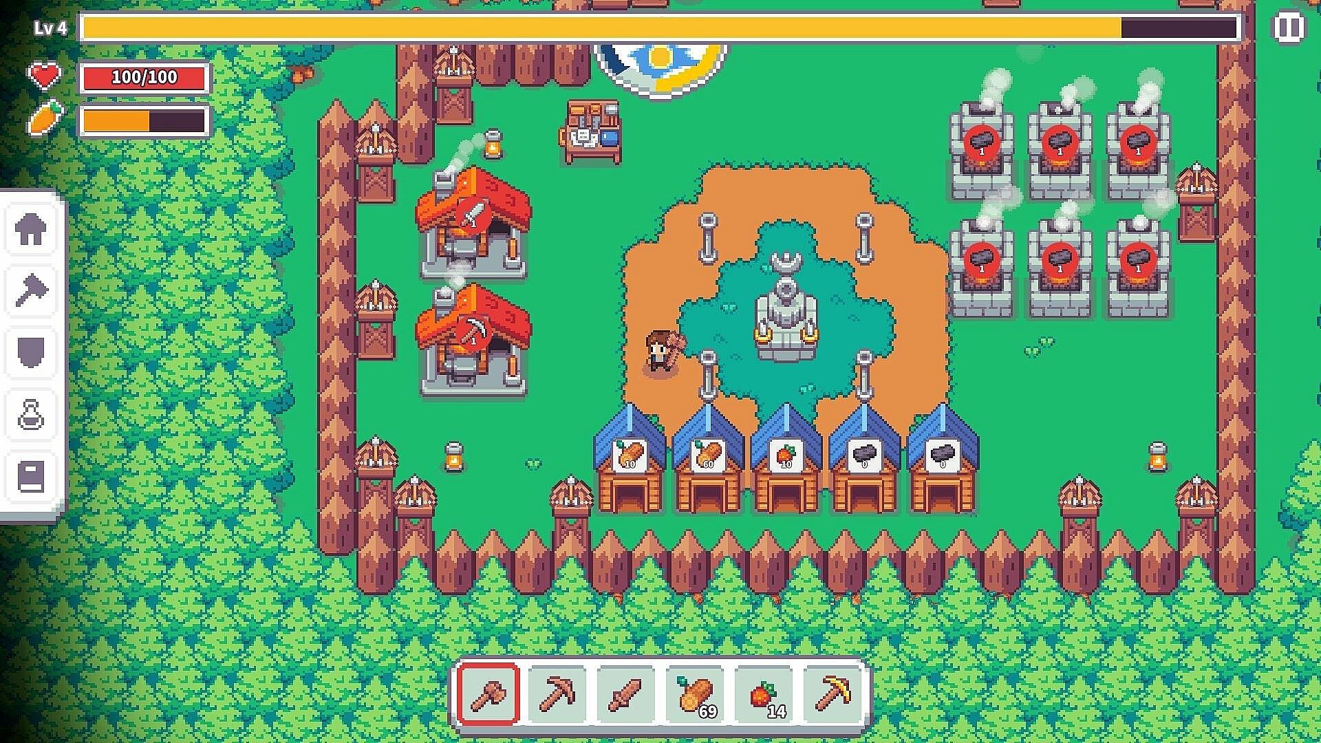 Swing your axe to chop trees, mine ore, and craft essential tools and defensive structures. Gather food and build fortifications to protect the altar.