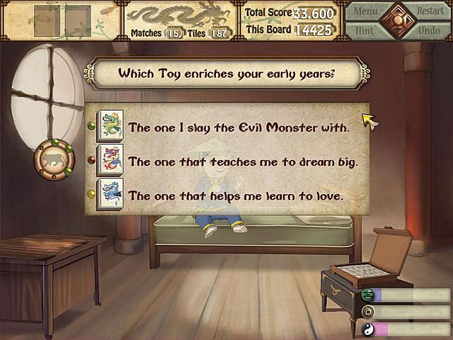 What's the meaning of happiness? You are Kwazi. Starting from a mysterious birth at a mountaintop monastery and ending as a wizened old man, you use your grandfather's ancient Mah Jong set to solve an ever-challenging series of puzzles. As you play Mah Jong Quest 3, you'll make life choices that take you though battles against dragons, unreturned love, twisty career paths, artistic fulfillment, utter devastation, spiritual awakening, a rebuilding, and ultimately a blossoming family. The story unfolds based on the decisions you make, so choose wisely. In the end, only you can match the tiles and find the balance that brings about true Happiness.