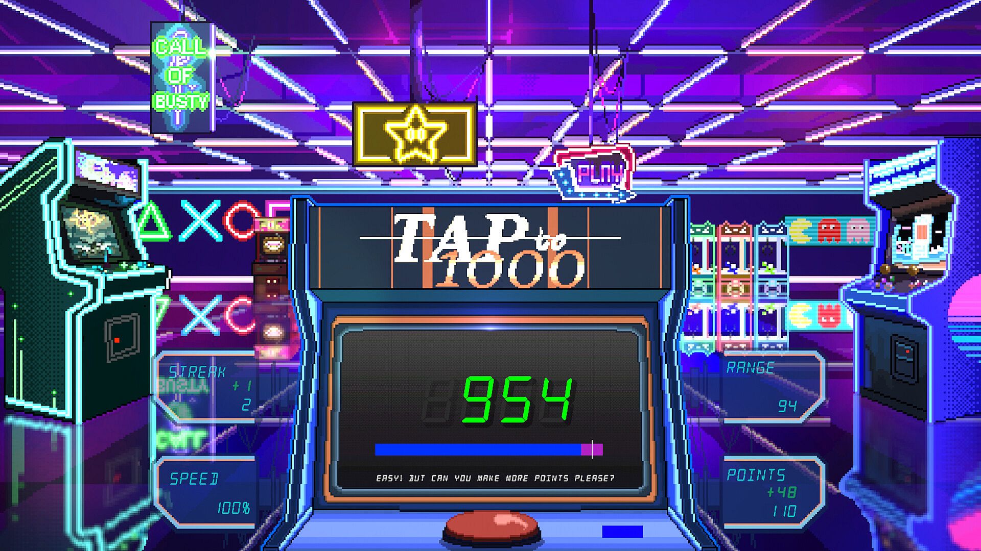 A counter increases every second. You must stop this counter as close to 1000 as possible without exceeding it. The more times you try, the more difficult it will be. The speed will increase and the machine's tolerance will decrease until you lose