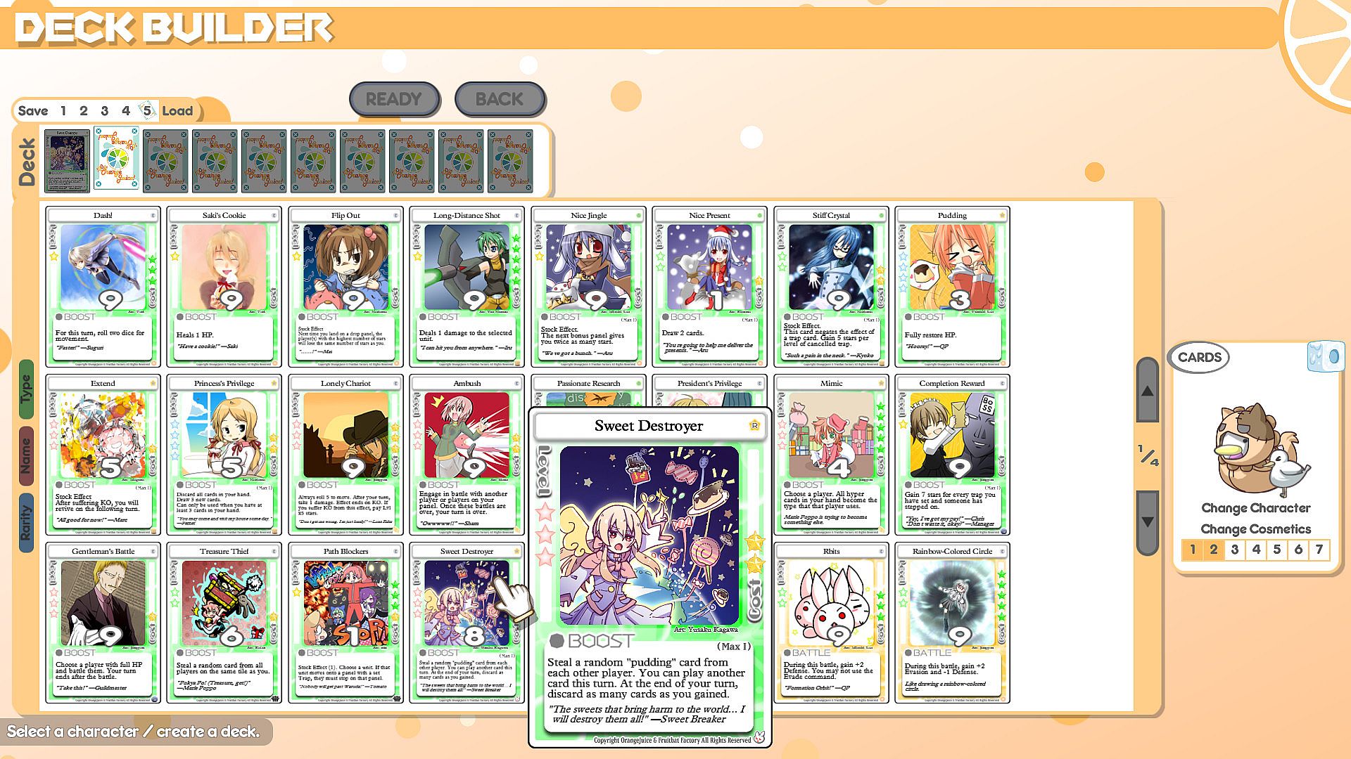 Boost your strategy game with 12 fresh cards from Orange Juice designers and artists like Hono and Coffgirl. This indie expansion adds rare, uncommon, and common cards across Boost, Battle, Trap, Event, and Gift types, including Sweet Destroyer, Sink or Swim, and Lucky Charm. Buy them straight from the in-game shop for seamless integration. Players deploy these cards in single-player or multiplayer matches, where everyone accesses them through the shared center deck. Cards work regardless of ownership, fueling dynamic turns in competitive play. Strategy fans who enjoy card-driven indie games get new tools to outmaneuver opponents.