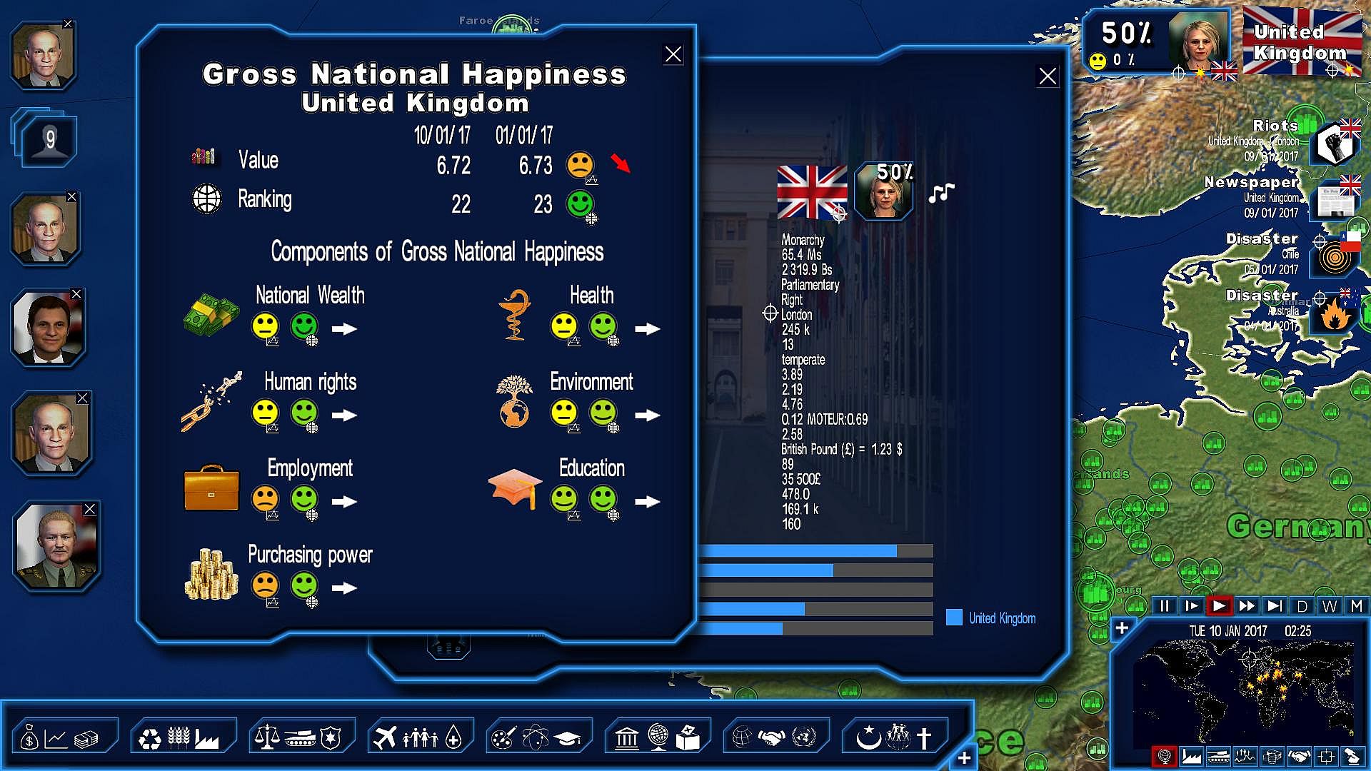- Gross National Happiness : improve the quality of life for your people by implementing reforms and try to raise your country’s global ranking.