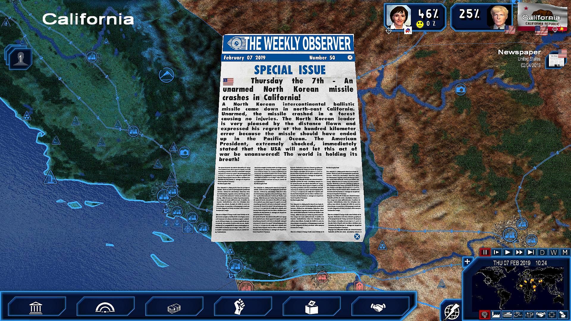 - USA-North Korea Global Conflict:after North Korea sends an unarmed intercontinental missile to the coast of the United States, tensions grow between the US and North Korean presidents. As the leader of the opposition party in the US, legally remove the current president, then eliminate the North Korean threat once and for all to prevent the start of a world war!
