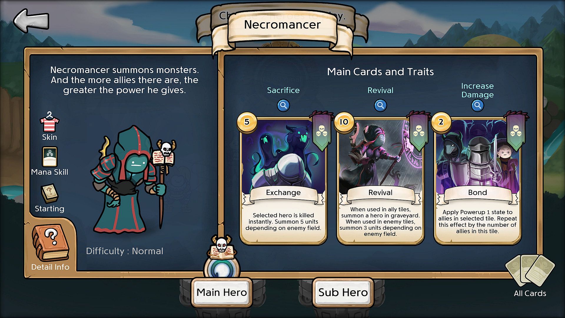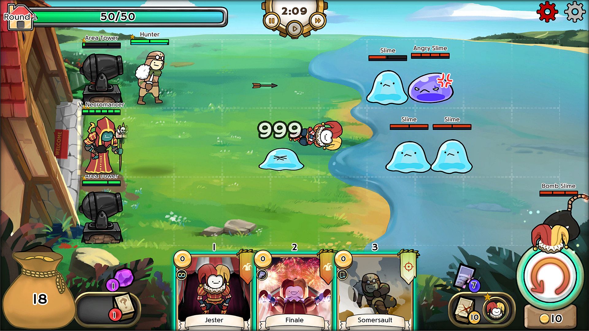 Two new heroes bring humor and necromancy to your strategy defense on PC. The Jester thrives amid crowds of enemies, gaining strength as more foes fill the field. Its mana skill demands high cost despite a quick cooldown, while the reroll sends it back to your hand as a card. Loot from enemies yields gold, tripling for those under debuff. The Necromancer calls forth monsters, boosting power with every ally present. Its mana skill grants a self powerup, but reroll trades home durability for summons in leftmost tiles based on enemy positions. Skeleton loot mirrors this by spawning units from the foe's field. Strategy fans who master enemy scaling and resource trades will dominate.