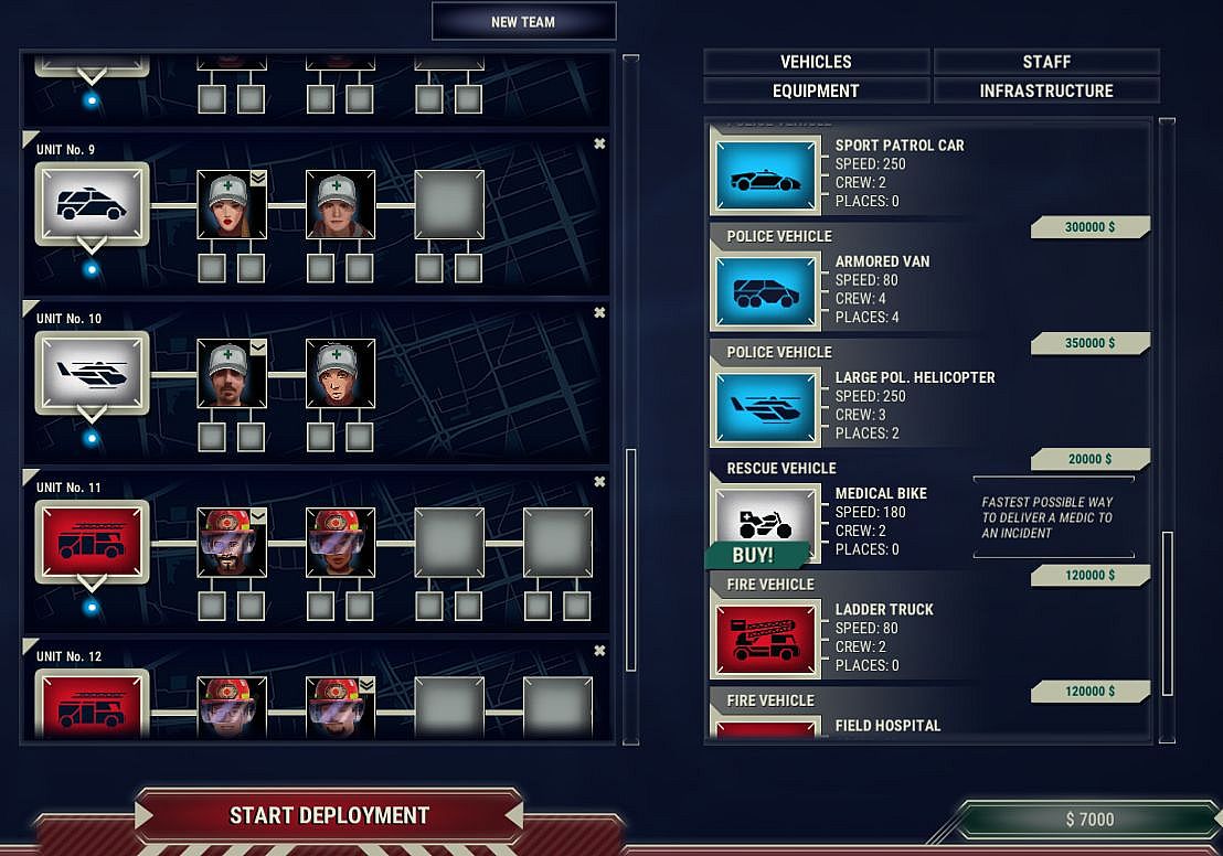 Add additional emergency vehicles and equipment to your teams to resolve new incidents that can happen in your city. All unavailable in the basic version!
