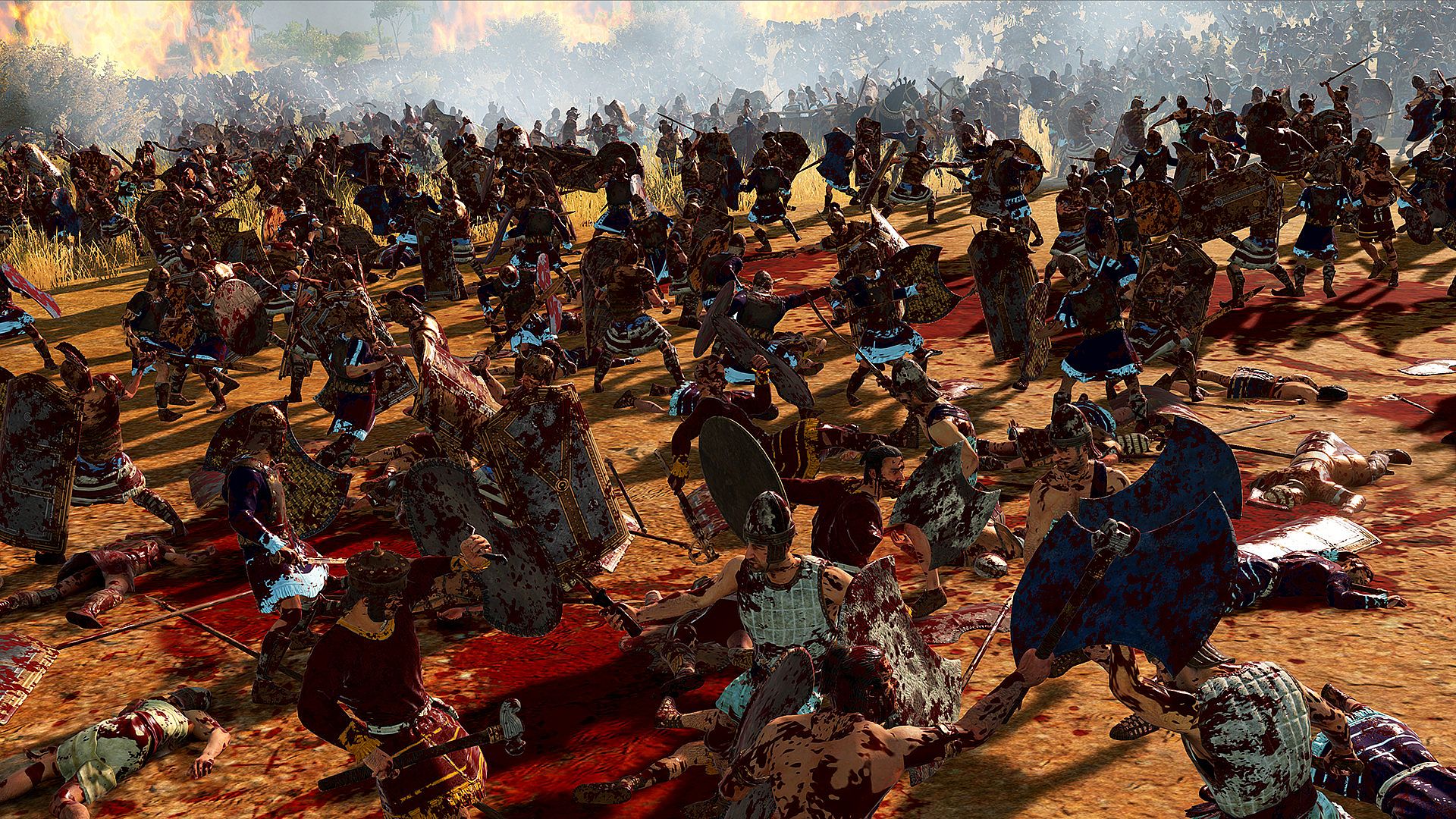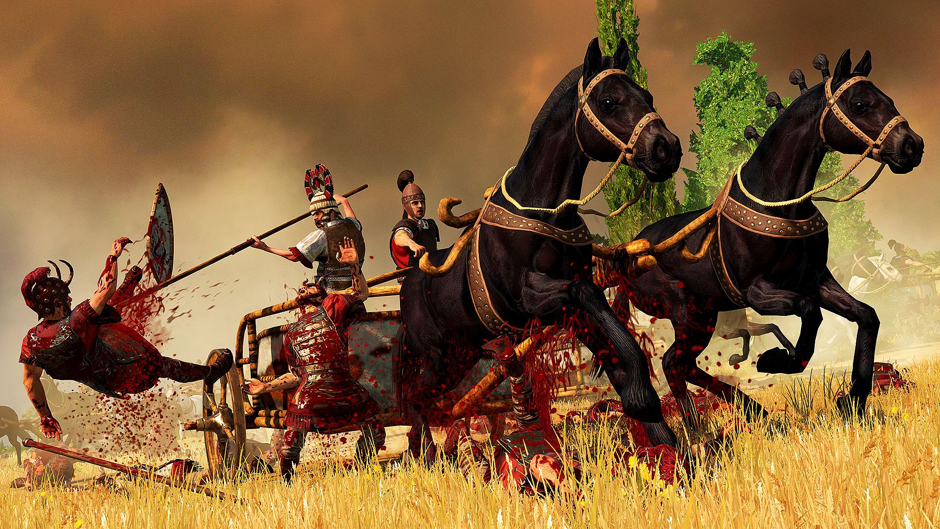 - — Krew rozpryskuje się podczas uderzeń broni, plamiąc pancerze, rydwany i konie