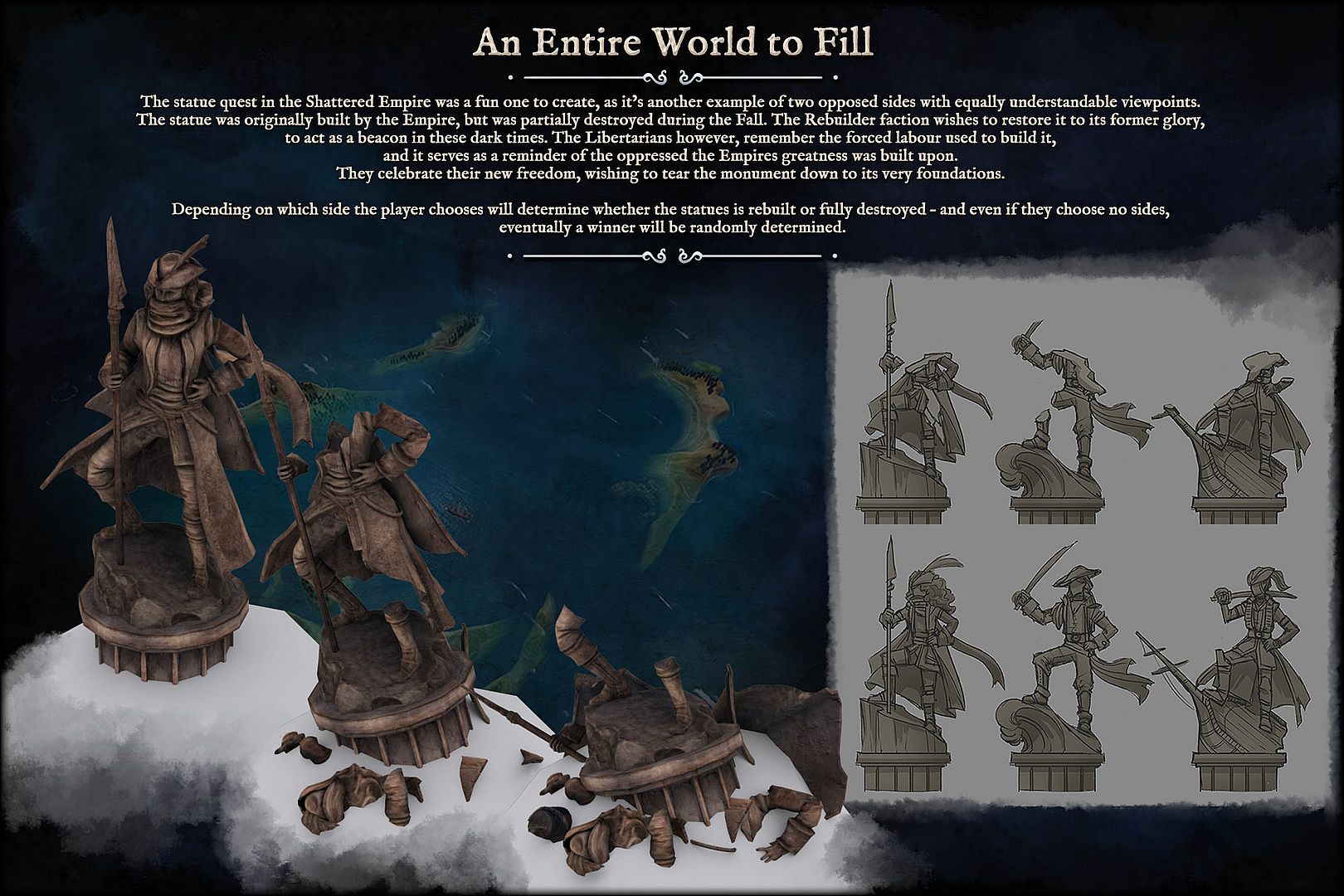 • Concept Development - the story behind our original artistic inspiration and how we translated that to concept art and in-engine graphics.