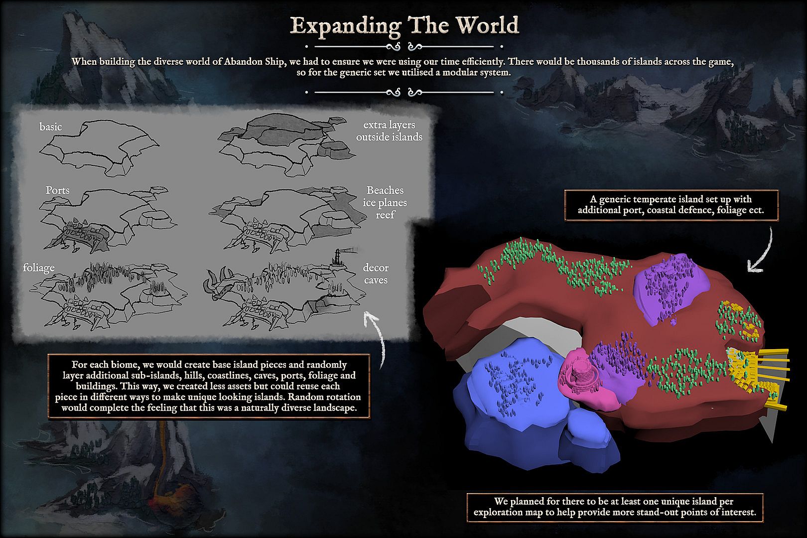 • Pre-Production - How we established everything from islands, characters, the logo and all the varying environmental modifiers.