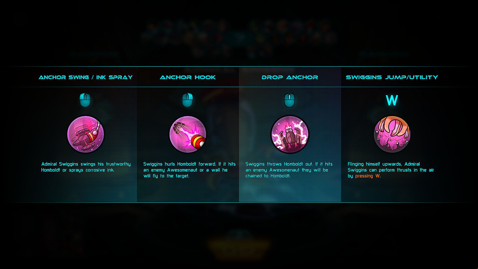 Admiral Swiggins is a complex fighter that pulls himself towards enemies and can chain enemies to the ground with his anchor. He trades his melee attack for a ranged ink shot while his anchor is not available. He comes equipped with the following abilities: