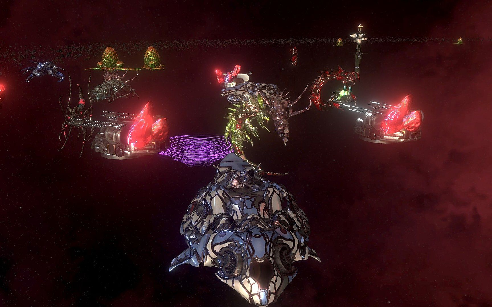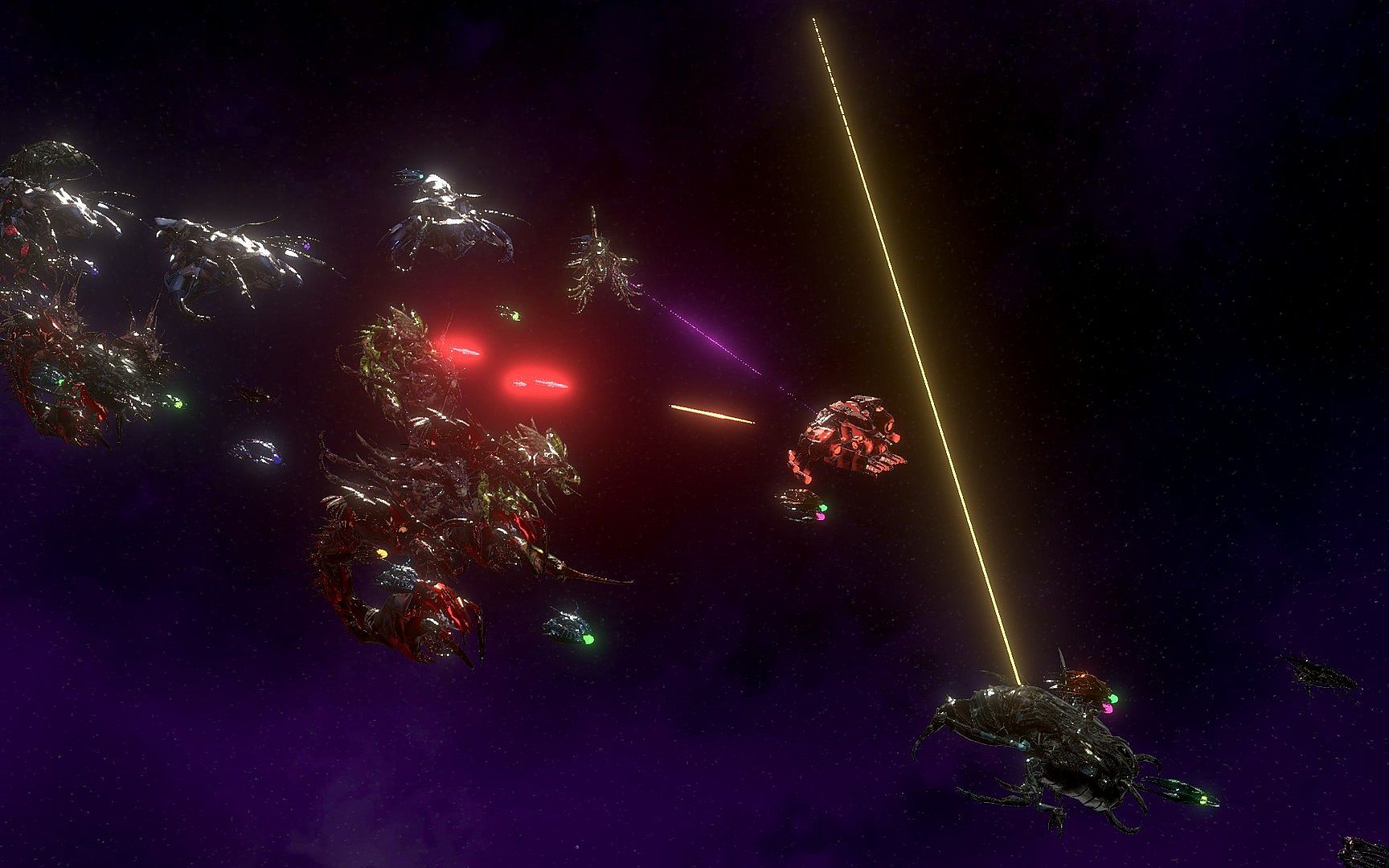 When we were alerted to strange wormhole signatures appearing on a nearby planet, we found countless ships matching Neinzul profiles pouring out, engaging the AI. The smaller ships, while being destroyed in droves, were broadcasting signals of friendly nature.After reaching the location of these strange wormholes, a large Neinzul vessel was spat out of the wormhole before it closed in on itself. It appears that it simply desires to leave this galaxy and migrate elsewhere to ensure its survival. Your science team believes it may be worth helping these new migrating Neinzul by escorting them to safety, as they may yield unexpected rewards. The choice is yours on whether to help them or leave them to distract the AI.