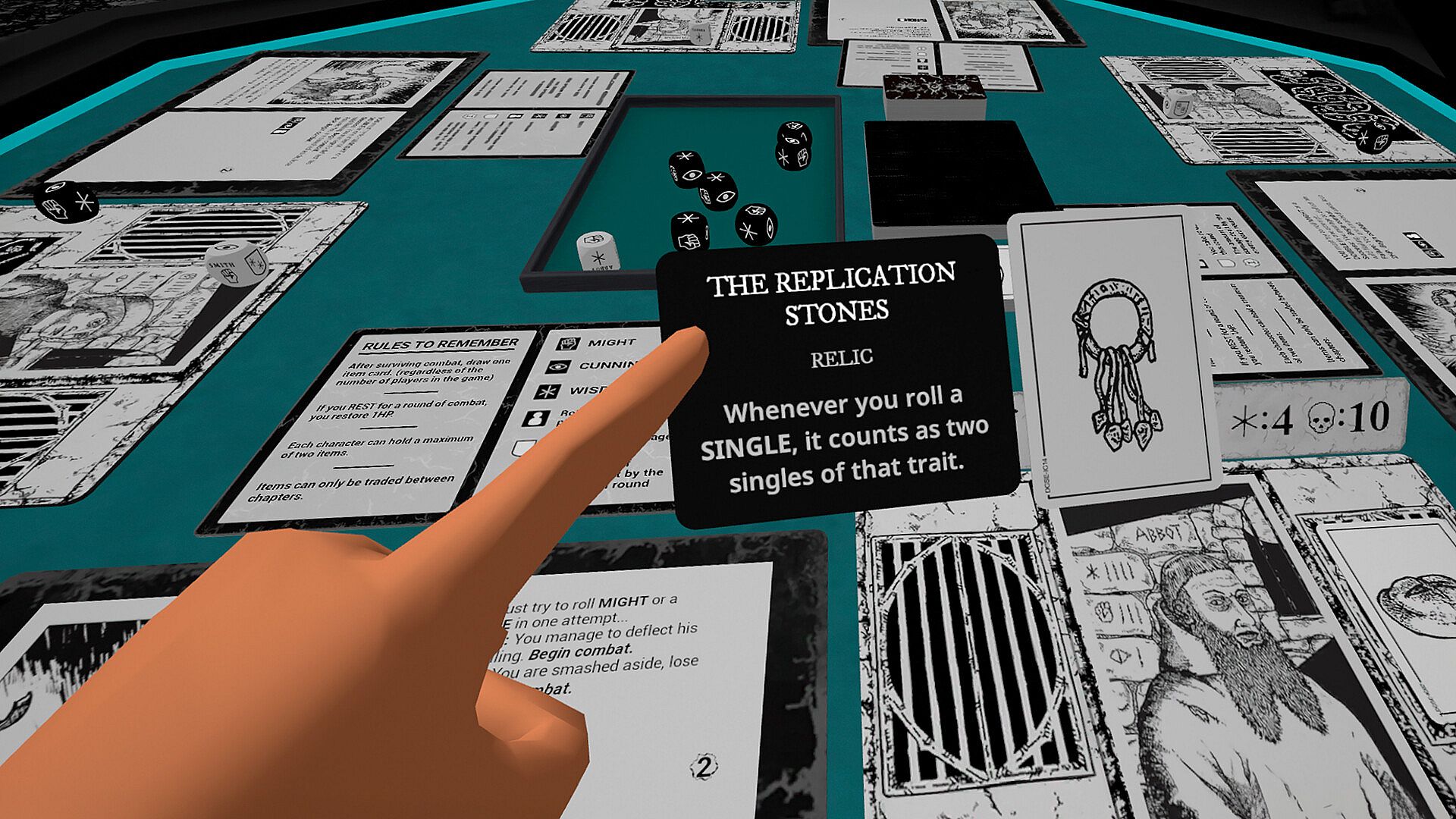 Players take on the roles of prisoners trapped in a dark, dangerous castle. Using custom dice, item cards, and teamwork, you must overcome horrors, traps, and challenges presented on beautifully illustrated chapter cards. Each card reveals a unique obstacle that brings the story to life.