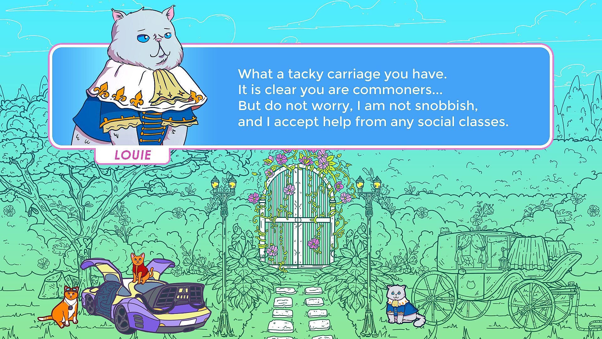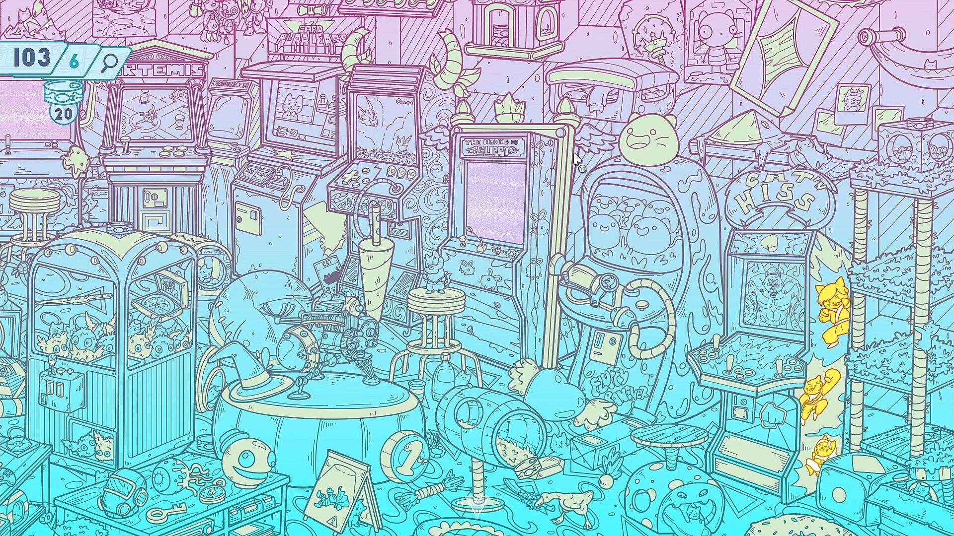 Join Leo and Fofiño as they explore game rooms across various eras! From an Old West Saloon to a Bourgeois Garden, a Prehistoric Playfield, and even the future, where Indie Games dominate! Search for kittens scattered through space and time!