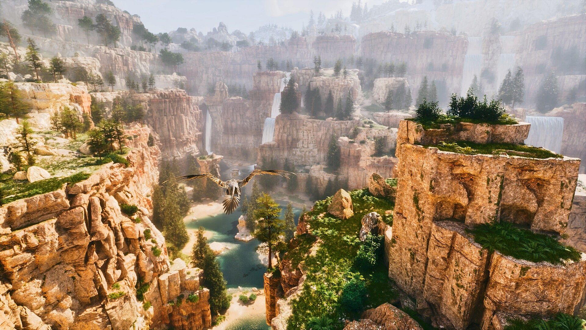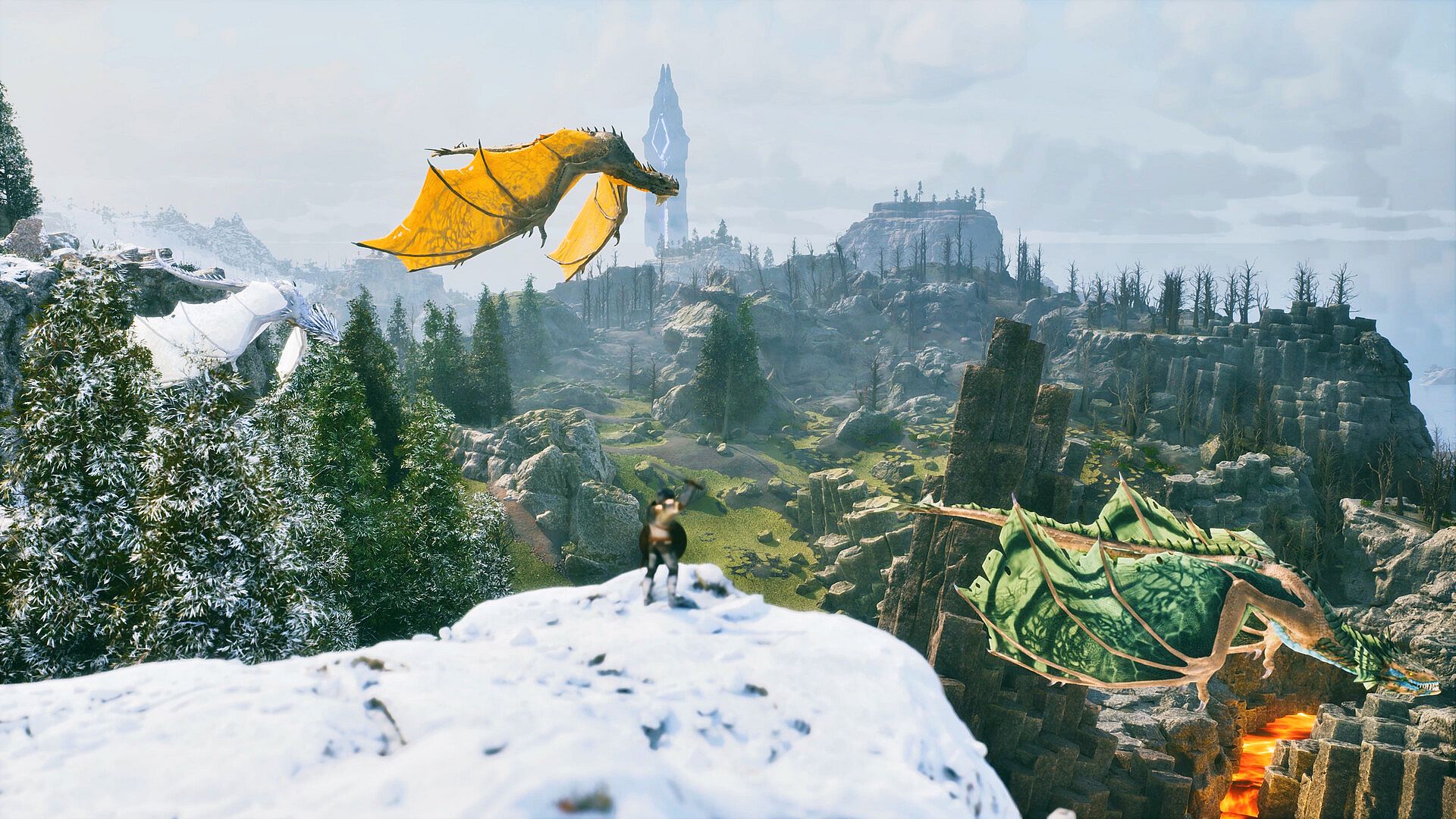 Brave the molten fury of an active volcano, delve into dungeon-filled ruins lost to time, or soar above the searing stone arches of Dragon’s Reach: looming like a scorched gateway between worlds carved by time and fire, where a deep cavern pulses with a beautifully eerie ambient glow and jagged crystals line the walls like teeth. Wander the wide, windswept Scotland Hills, find serenity along the shores of a pristine frozen lake, or carve your path through mist-shrouded swamps and the frozen dens of Polar Bears and Ice Wyverns. The Bison roams these lands as a horned juggernaut of highland havoc, its brute strength matched only by its surprising utility. And somewhere between legend and survival... the mythical Griffin awaits.