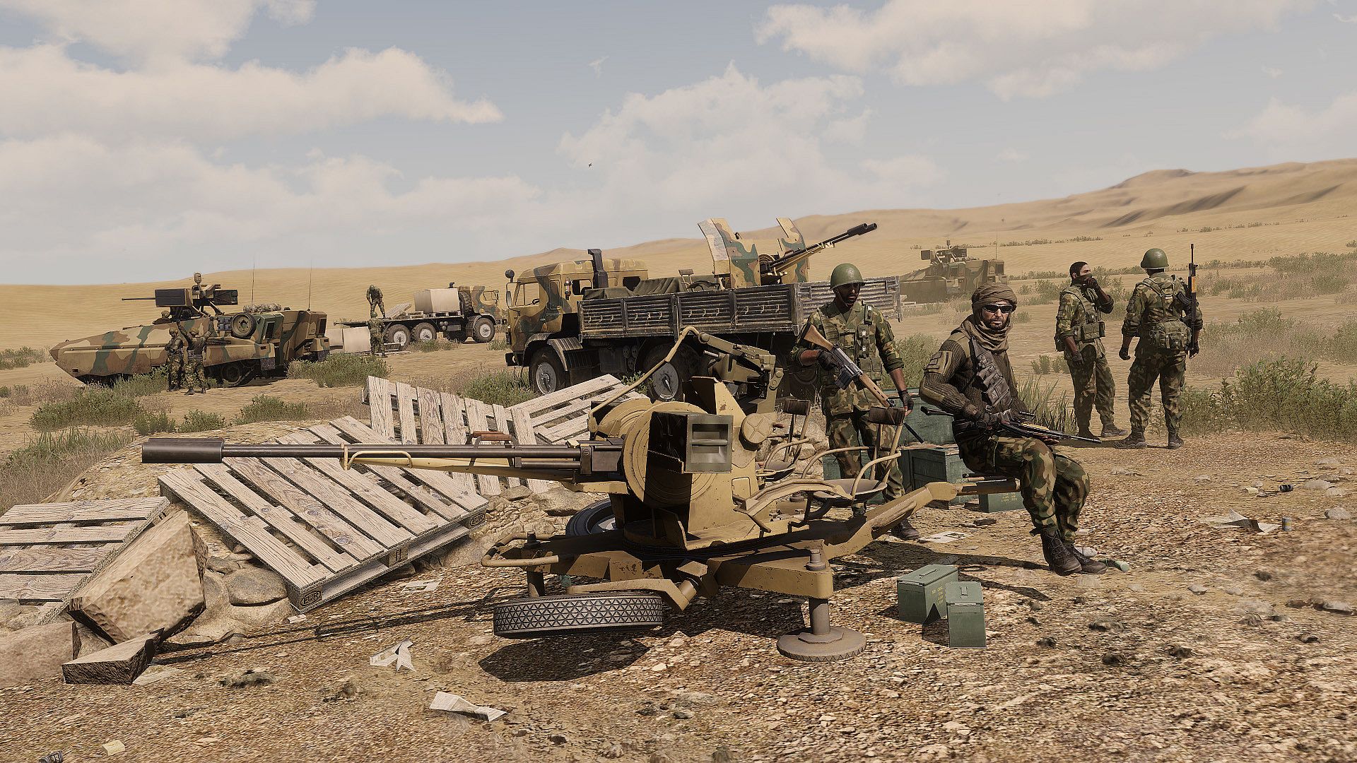 Western Sahara wprowadza nowe, imponujące warianty istniejących pojazdów z Arma 3. Linię Marshall uzupełniono o pojazd dowodzenia, moździerz 60 mm i system naprowadzanych rakiet przeciwpancernych. Klasyczny Zamak mknie przez upalny teren w nowych wariantach: lawety, towarowym i przeciwlotniczym. Wóz terenowy otrzymał pustynny i prowizoryczny pancerz, a rosyjski helikopter PO-30 Orca został wyposażony w nowoczesne, lekkie pancerne płyty, osłaniające go przed ogniem z broni ręcznej. Arsenał został poszerzony ponadto o nowe warianty MSE-3 Marid z obsługiwaną przez strzelca wieżyczką oraz BTR-K Kamysz w wariancie do zwalczania pojazdów. Nie można też zapomnieć o wspaniale zremasterowanym elemencie z Arma 2 – armacie przeciwlotniczej ZU-23.