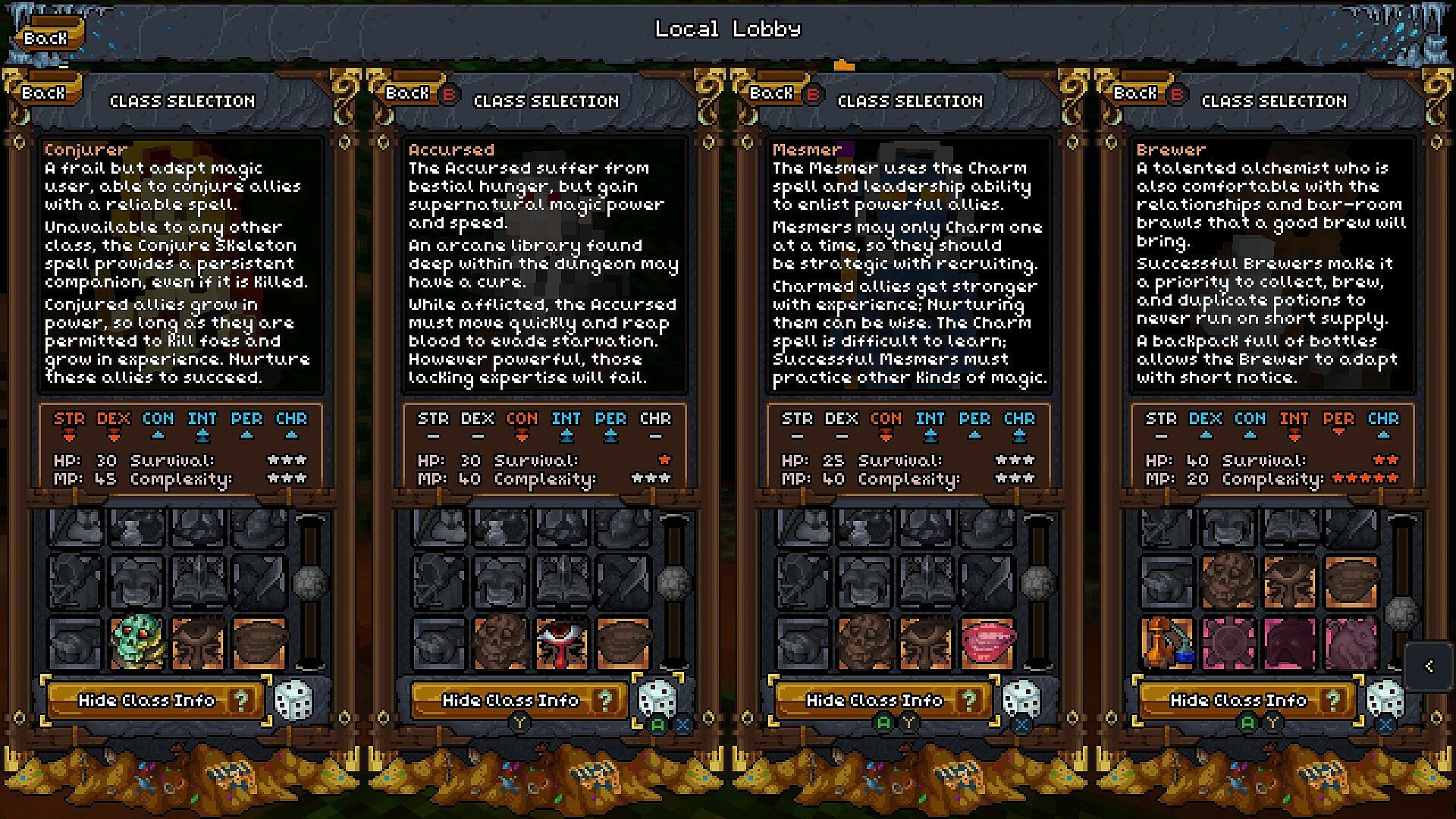 The Brewer starts with a handy-dandy backpack which increases their inventory space. They also have an Alembic which allows them to brew powerful potions!