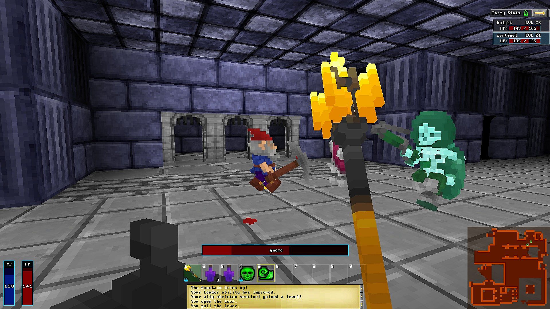 The Mesmer has a staff, and eventually can learn a spell, which allows her to enlist the service of foes to protect her. Use your wiles to survive!