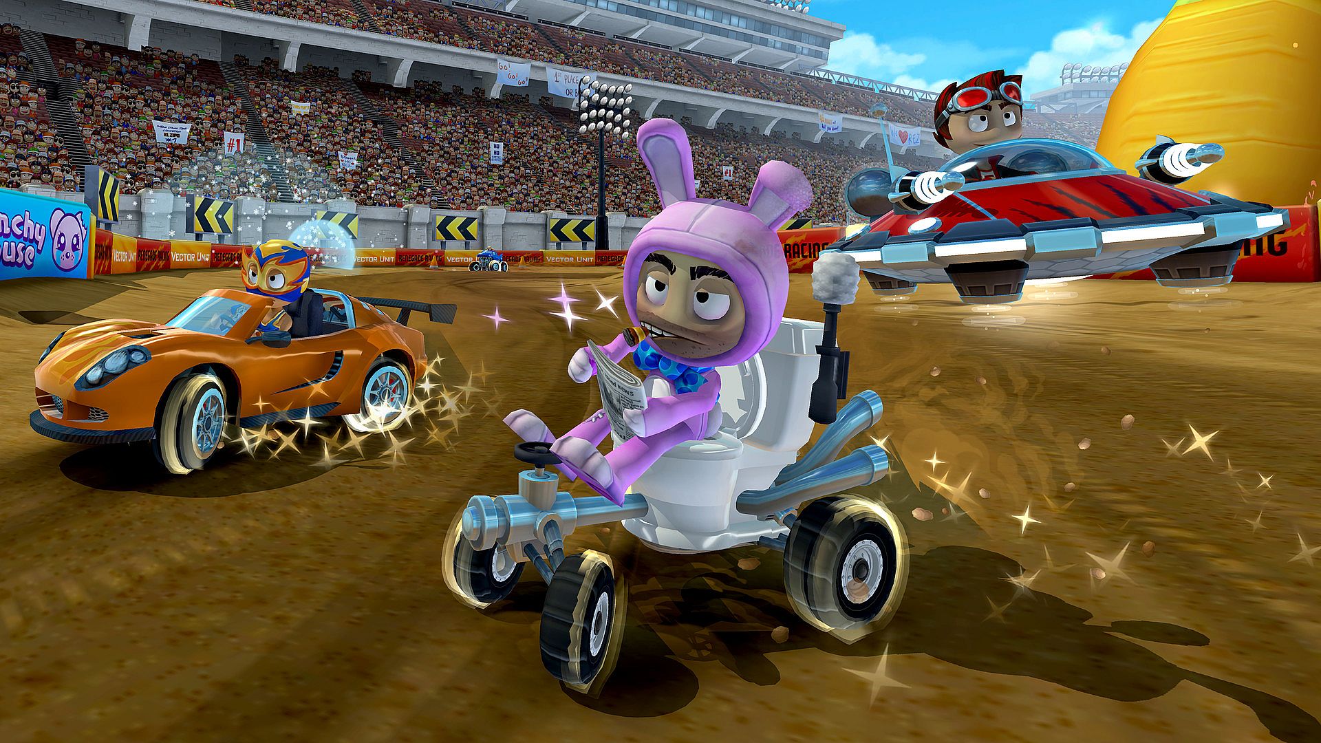 Add four outrageous vehicles to your Beach Buggy Racing 2: Island Adventure garage with the Oddball Car Pack. Race ahead in a heavy-duty six-wheel tank that smashes rivals, a hovering UFO that leaps over hurdles, a speedy sanitation wagon shaped like a toilet, or a station wagon that launches food to outpace opponents. These rides come fully unlocked for instant action on PC. Complete dedicated vehicle missions to earn exclusive gold finishes for each one and dominate leaderboards. Friends join the chaos in toilet-themed dashes or tank-powered crushes. This set delivers wacky racing fun for players who crave absurd vehicle showdowns.