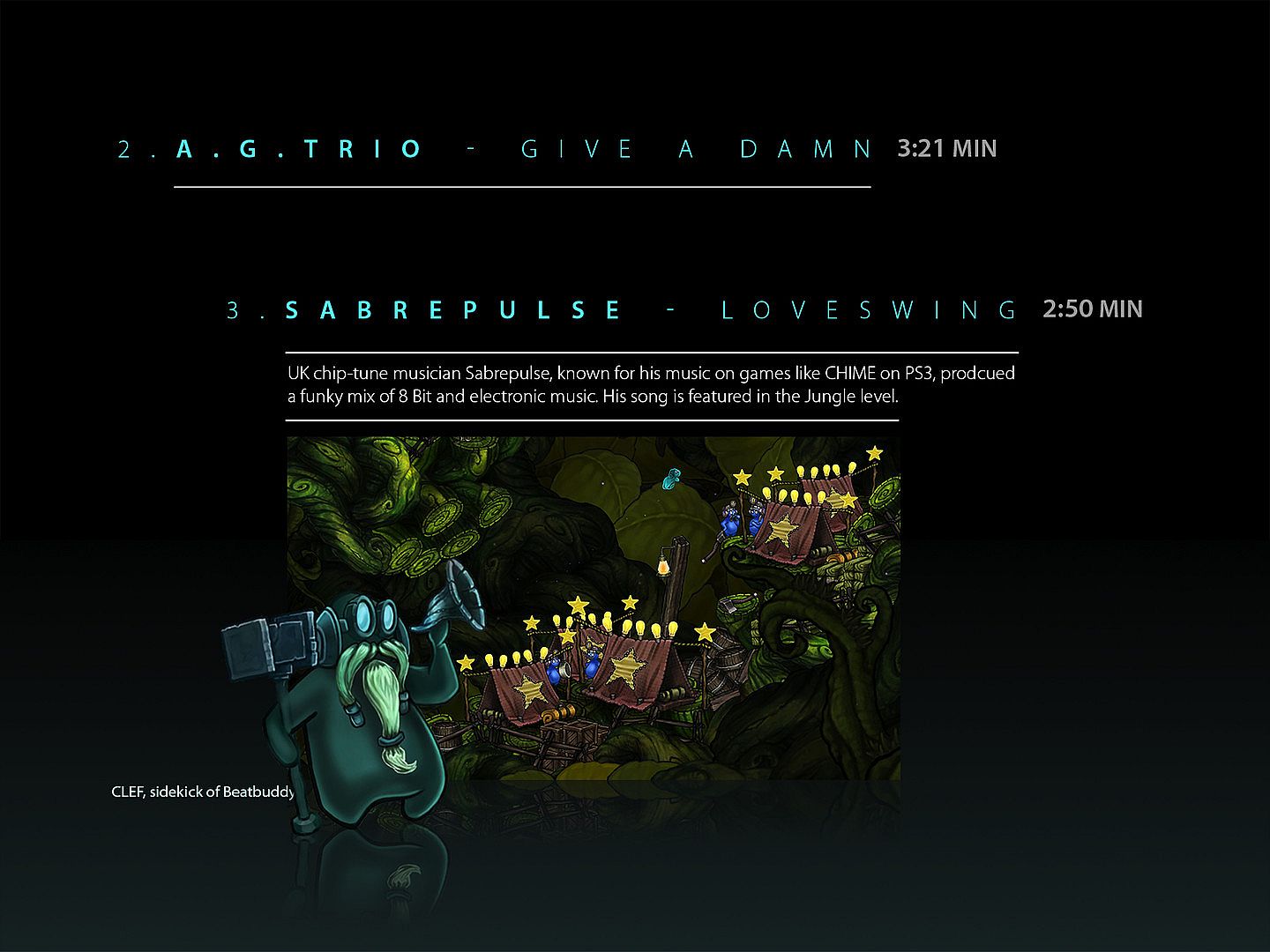 The official Beatbuddy soundtrack features exclusive songs by artists like Austin Wintory, Parov Stelar, Sabrepulse, Ari Pulkinen and more. The crazy mix of tunes goes all the way from electro swing to old school 80's rock music. For the first time you can enjoy the songs from Beatbuddy in the original mixes of the artists. The soundtrack is based on the awarded STEAM game Beatbuddy. Developed by German game studio THREAKS, Beatbuddy is the first game in which players can enjoy music as an interactive playable remix. Each contributor to this soundtrack has a dedicated world in the game, in which each instrument of their song is visualized by individual game mechanics. Beatbuddy was a very exciting project booth for the developers and musician who contributed 10 exclusive songs to this album.