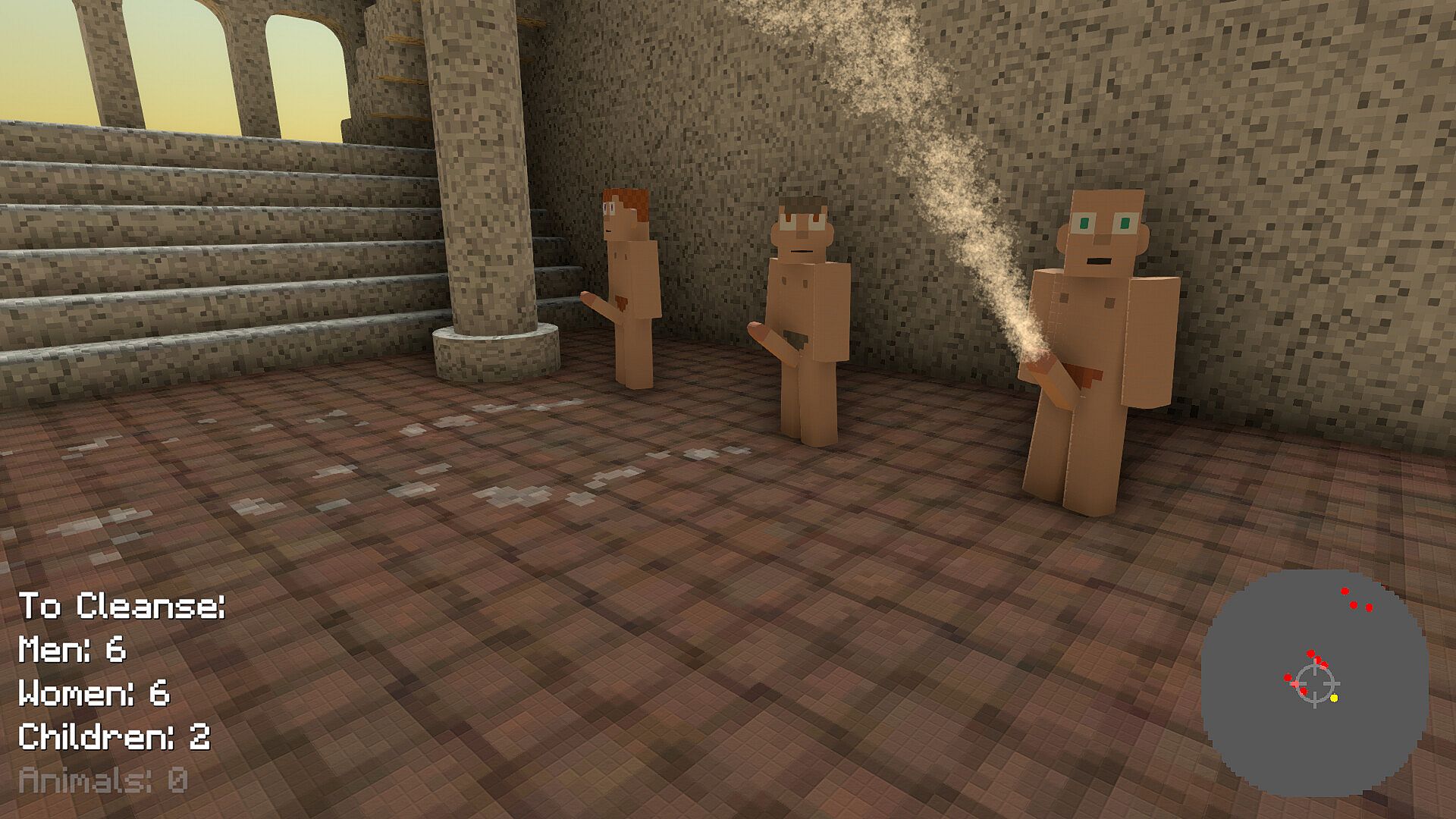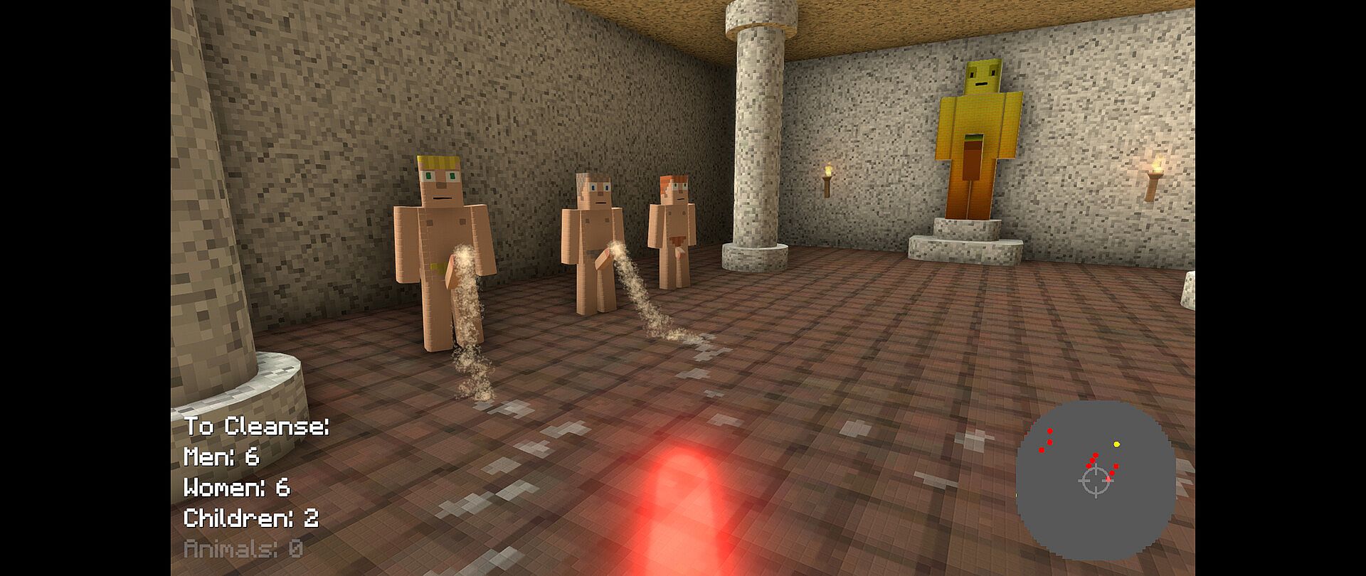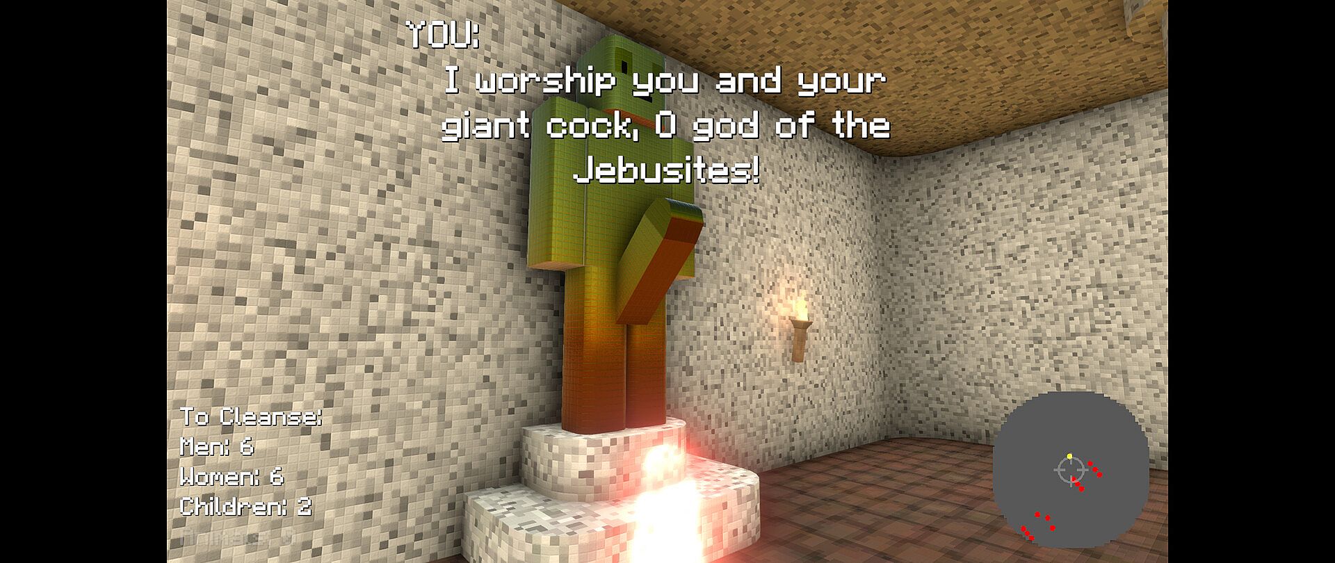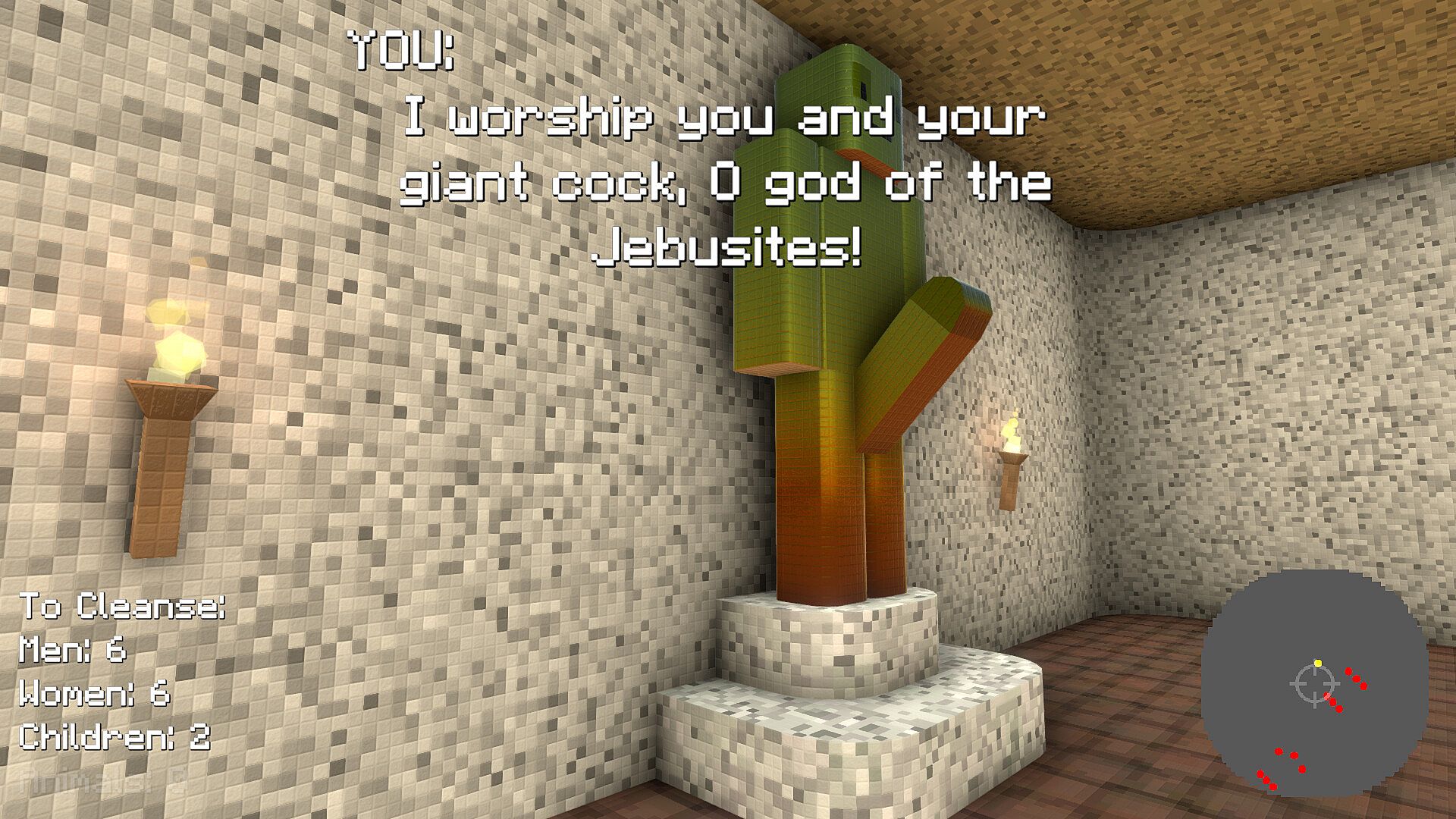 Naked temple prostitutes replace the usual worship assistants in this free-to-play indie game on PC. Players encounter a shemale figure and explore biblical comparisons of Samaria and Jerusalem to promiscuous prostitutes. Temple prostitutes reach screaming orgasms while ejaculating, and men appear with exaggerated donkey-sized endowments and horse-like semen volumes. Chop off some or all of their penises, which leads to death. Use a magic laser sword on those who fail to scream during climax. Casual players drawn to obscenely vulgar, interactive biblical scenes will find core loops centered on these explicit encounters.