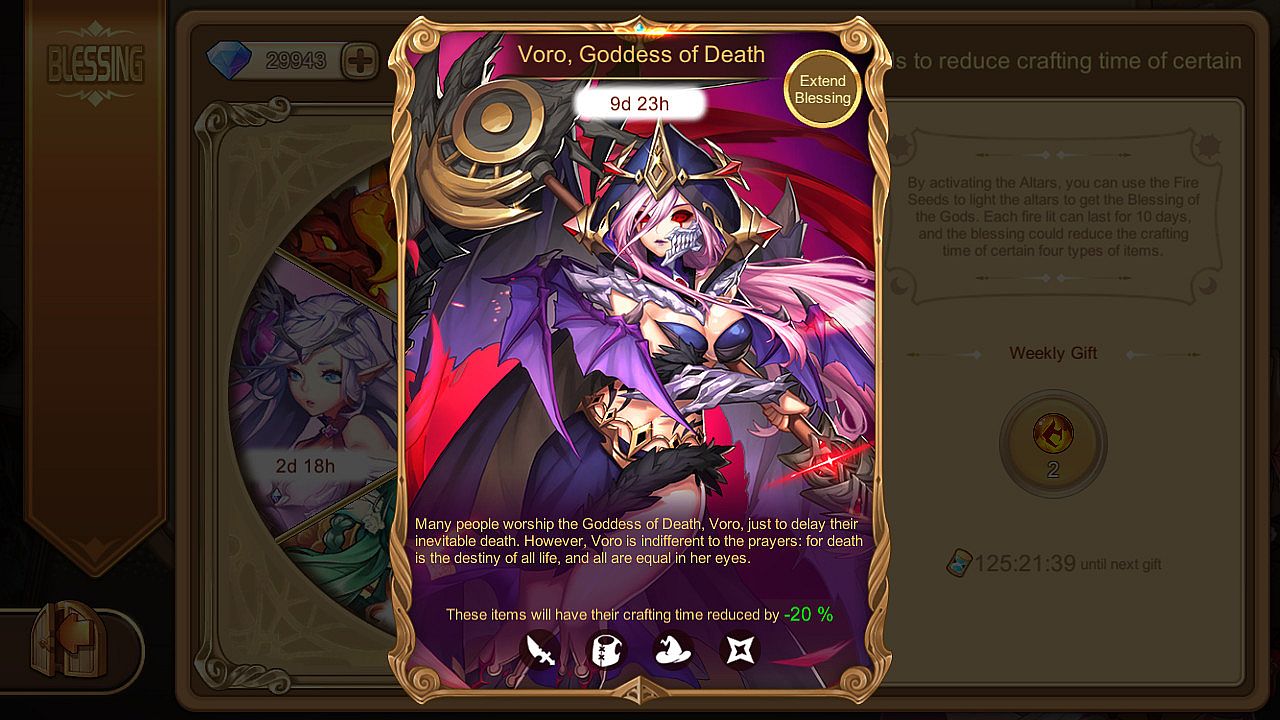 Godness of Death Voro——Reduce the crafting time of Daggers, Leather Armors, Hats and Darts by 20%