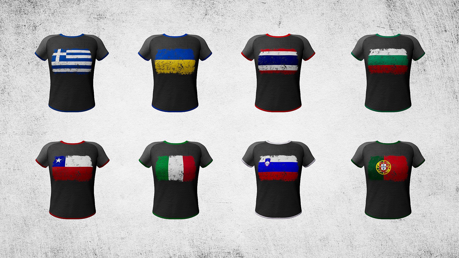 This pack of cosmetic items contains clothing patterns for both male and female characters, supporting hoodies, t-shirts, long-sleeve t-shirts, bikini tops and swimsuits.