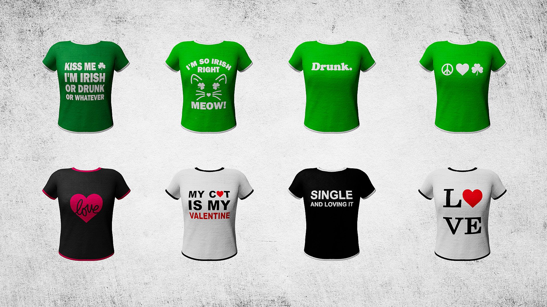 This pack of cosmetic items contains clothing patterns for both male and female characters, supporting hoodies, t-shirts and long-sleeve t-shirts.