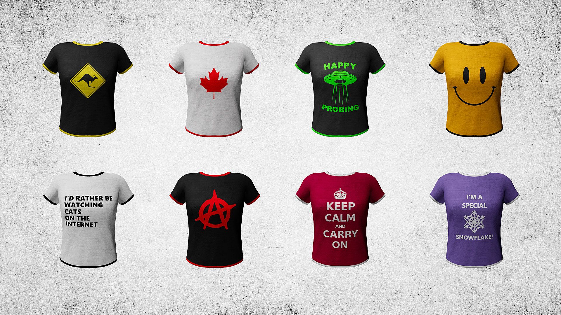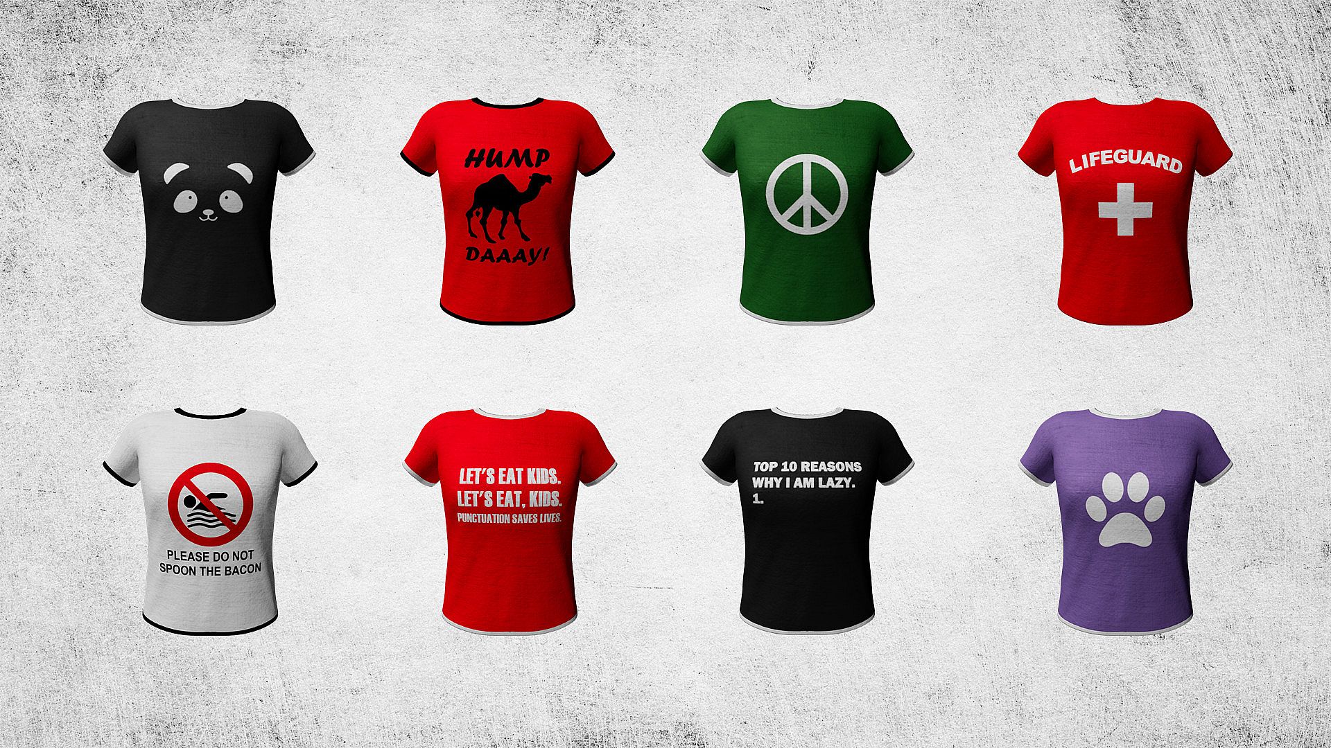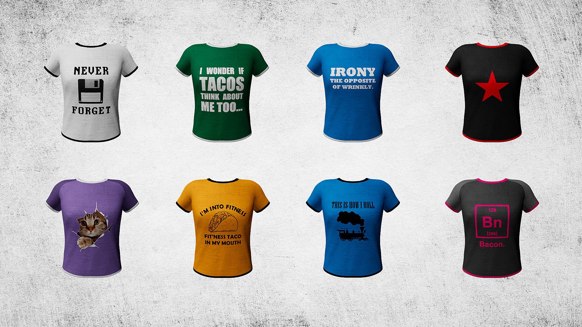 This pack of cosmetic items contains clothing patterns for both male and female characters, supporting hoodies, t-shirts and long-sleeve t-shirts.