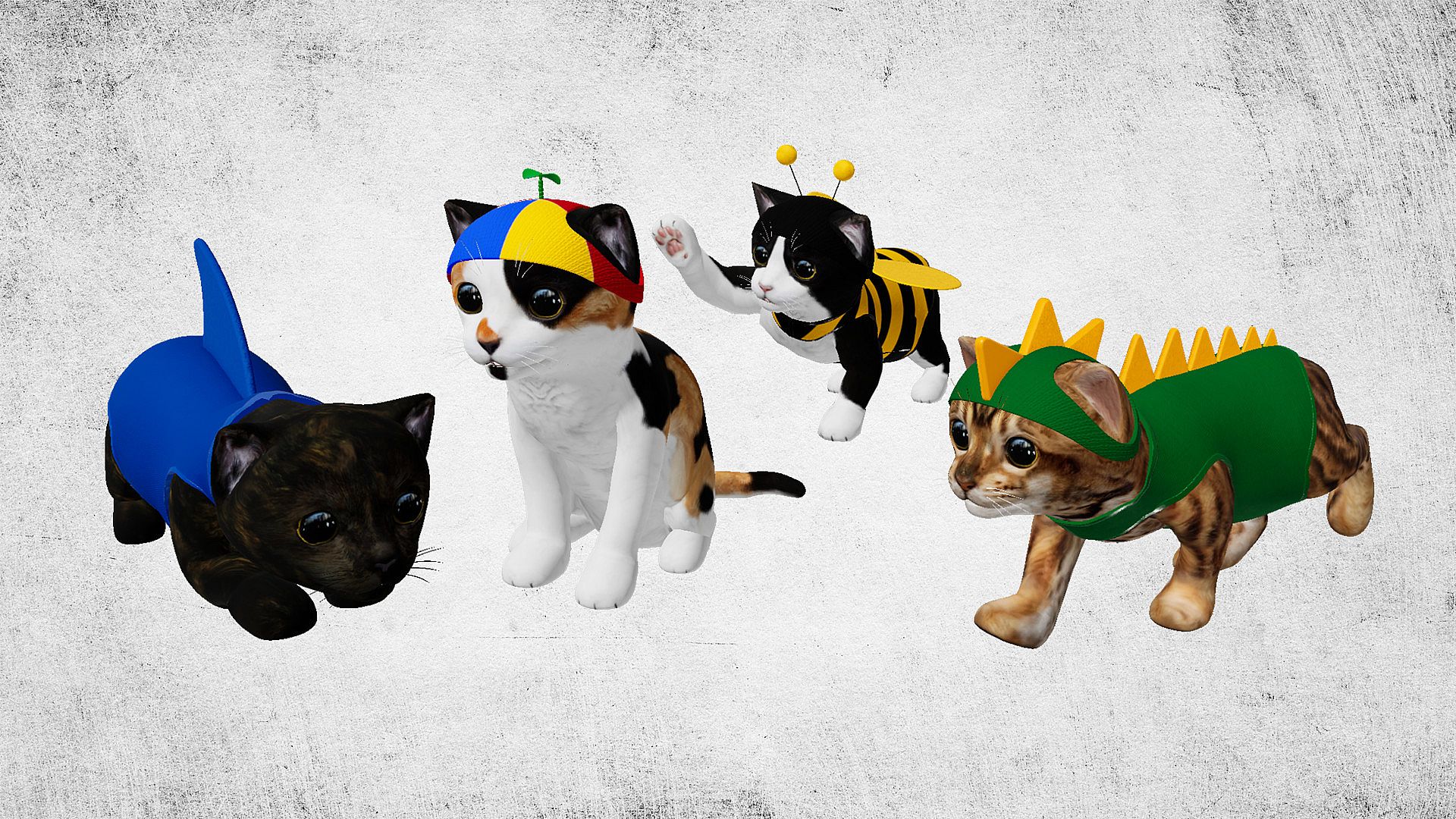 - 3 Cat Outfits (Bee, Dinosaur, Shark) + 2 Hats (Propeller, Pumpkin) + 1 Collar (Glow)