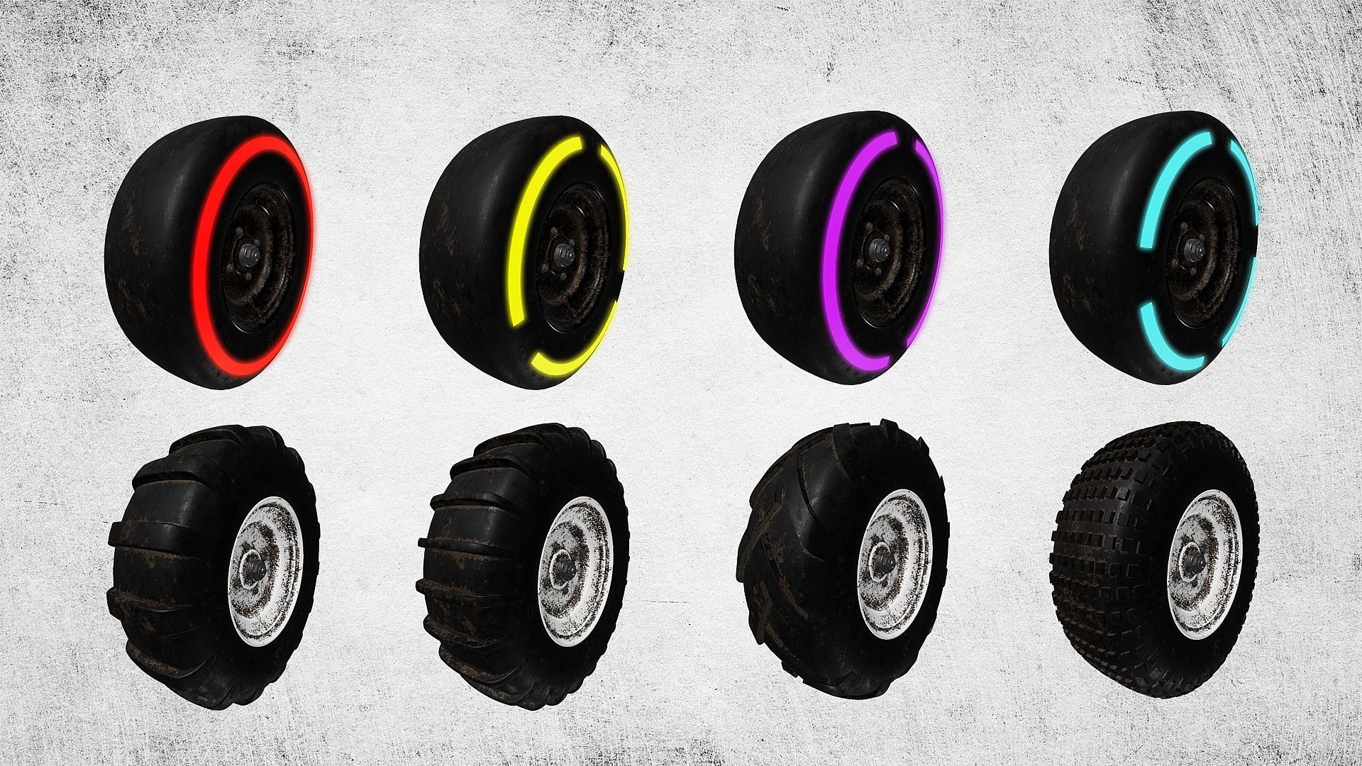 This pack of cosmetic items contains 8 tires, 8 rims, 8 steering wheels, 10 horns, 2 hood ornaments and Neons. A glow kit is also included for horse mounts.